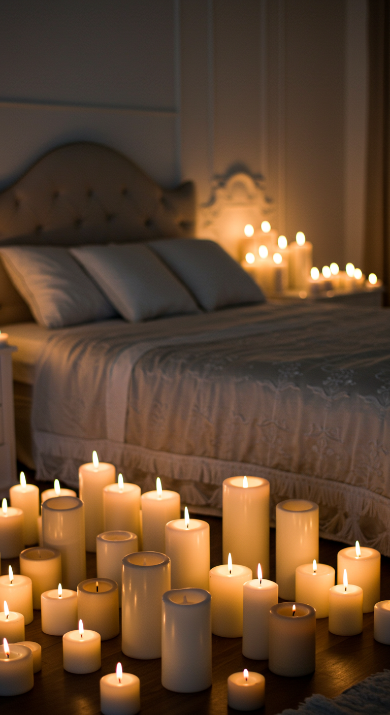 Les bougies sont l’élément incontournable d’une ambiance romantique réussie. Disposez des bougies de différentes tailles autour de la chambre : sur les tables de chevet, le rebord de fenêtre, et même au sol dans des photophores sécurisés. Privilégiez les bougies parfumées aux senteurs aphrodisiaques comme la vanille, le jasmin ou la rose. L’éclairage à la bougie crée une lumière douce et chaleureuse qui sublime la peau et apaise l’esprit. Pour une sécurité optimale, optez également pour des bougies LED réalistes que vous pouvez laisser allumées toute la nuit.