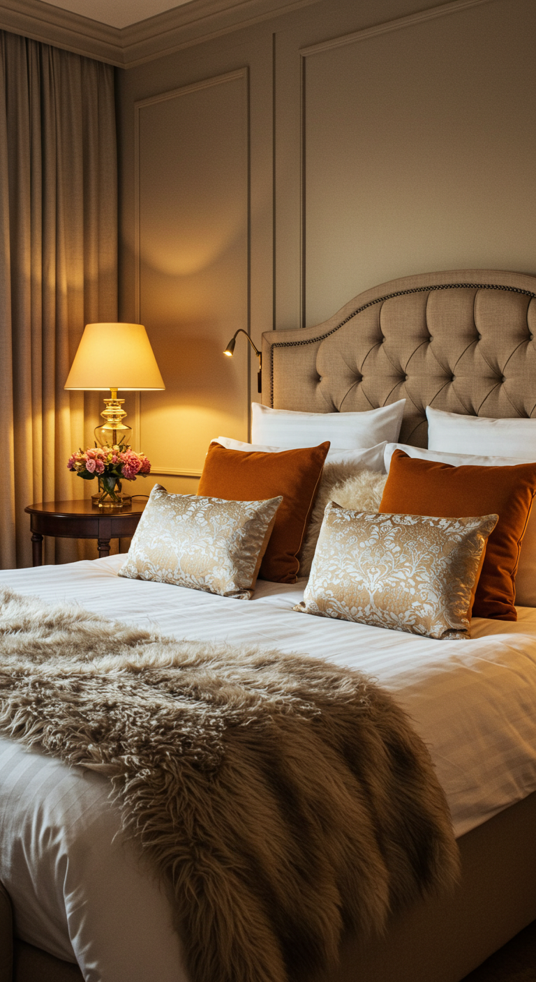 Le secret d’une chambre cocooning réside dans la superposition de textures variées : lin froissé, velours lisse, fausse fourrure moelleuse, soie fluide. Cette richesse tactile invite à la caresse et au confort.