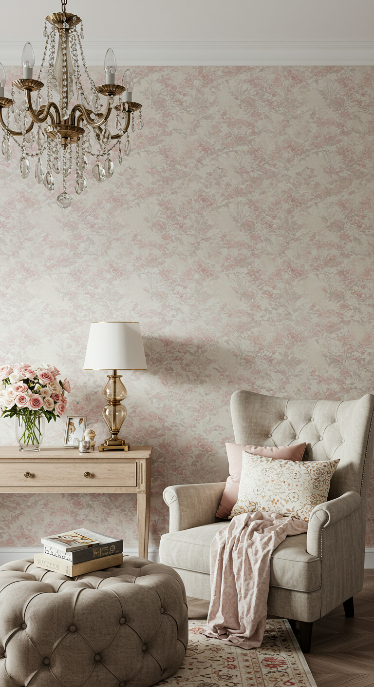 Créez un mur d’accent avec un papier peint aux motifs floraux délicats. Les roses anciennes, pivoines ou branches de cerisier en fleurs apportent une touche romantique intemporelle. Privilégiez les tons poudrés sur fond blanc ou crème pour éviter la surcharge visuelle. Ce détail décoratif transforme votre chambre en jardin secret romantique et ajoute de la profondeur à l’espace.