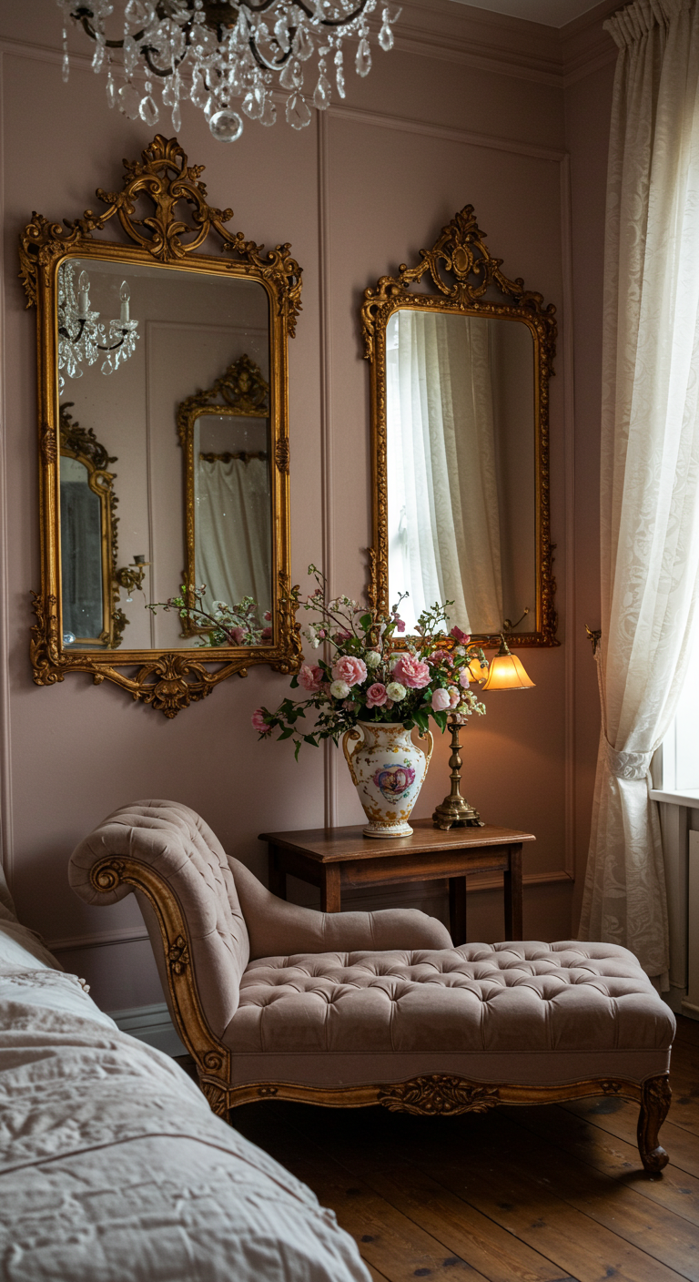 Les miroirs anciens aux cadres dorés reflètent et multiplient la lumière tout en ajoutant une touche d’élégance vintage. Disposez-les stratégiquement pour créer des jeux de reflets avec vos bougies et guirlandes. Un grand miroir posé contre le mur ou plusieurs petits miroirs disposés en composition murale apportent caractère et romantisme à votre espace.