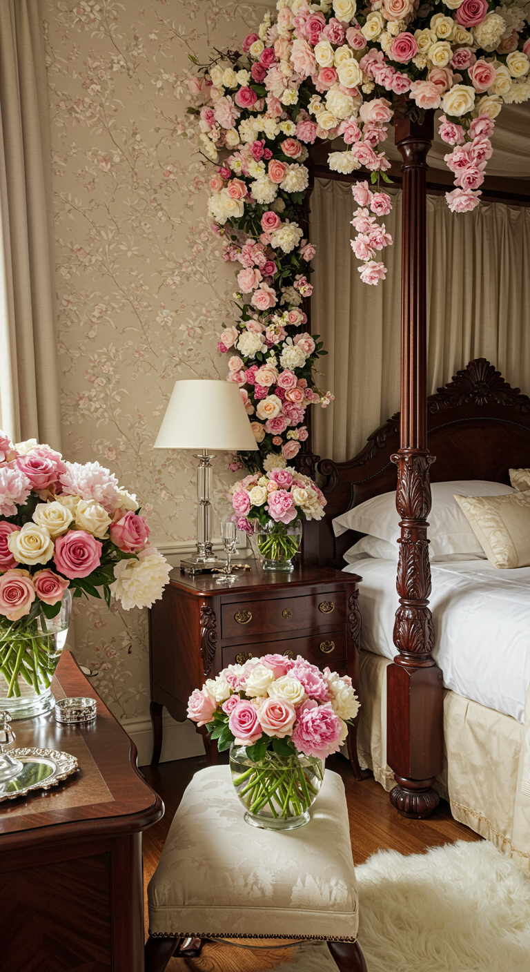 Rien ne vaut la beauté naturelle des fleurs fraîches pour parfumer et embellir une chambre romantique. Composez des bouquets de roses, pivoines, ou lys dans des vases en cristal ou en céramique blanche. Disposez-les sur la table de chevet, la coiffeuse ou près de la fenêtre. Renouvelez-les régulièrement pour maintenir fraîcheur et parfum naturel dans votre cocon d’amour.
