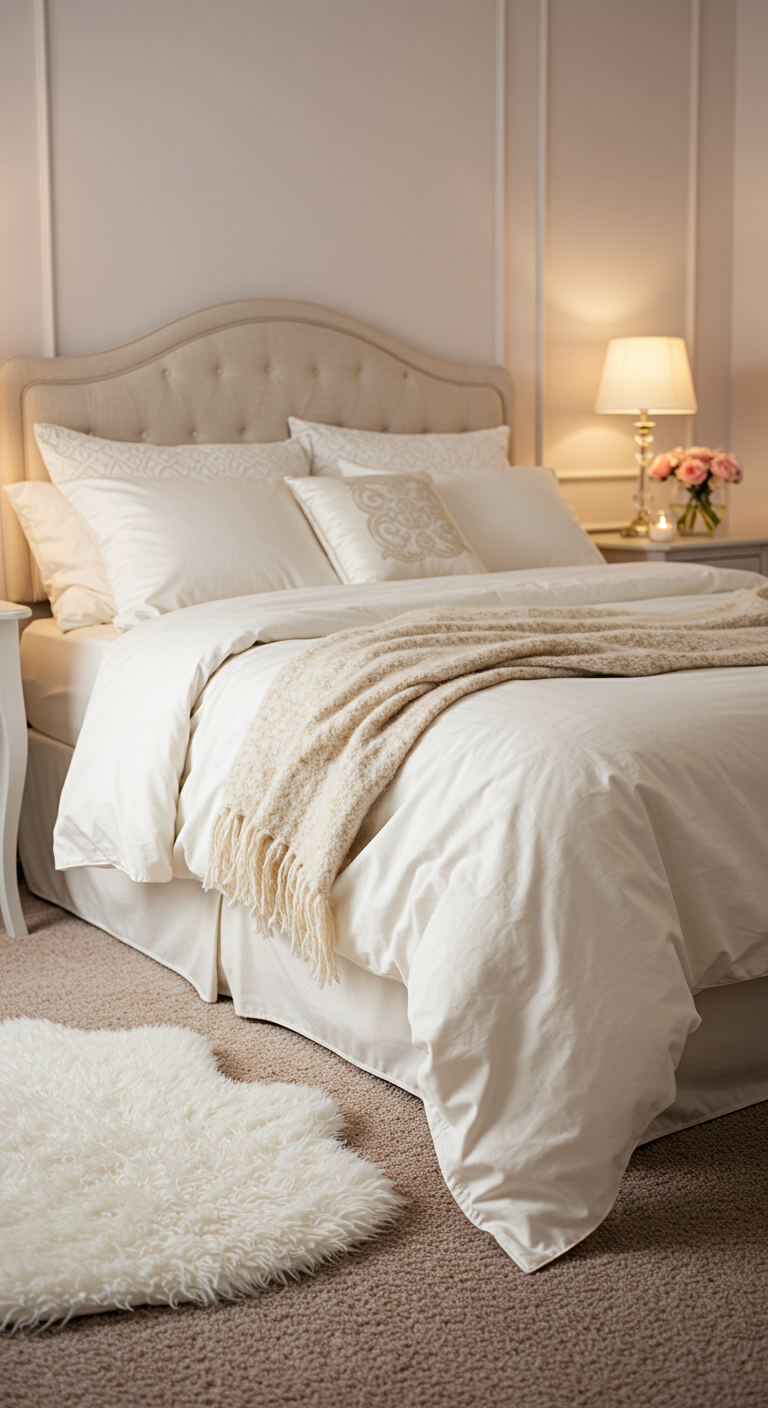 Un tapis moelleux au pied du lit transforme l’expérience sensorielle de votre chambre. Choisissez une matière douce comme la laine, le coton ou la fausse fourrure dans des tons neutres. Ce détail pratique et esthétique réchauffe l’atmosphère et invite à prolonger les moments d’intimité au sol, tout en protégeant vos pieds du froid des carrelages ou parquets.