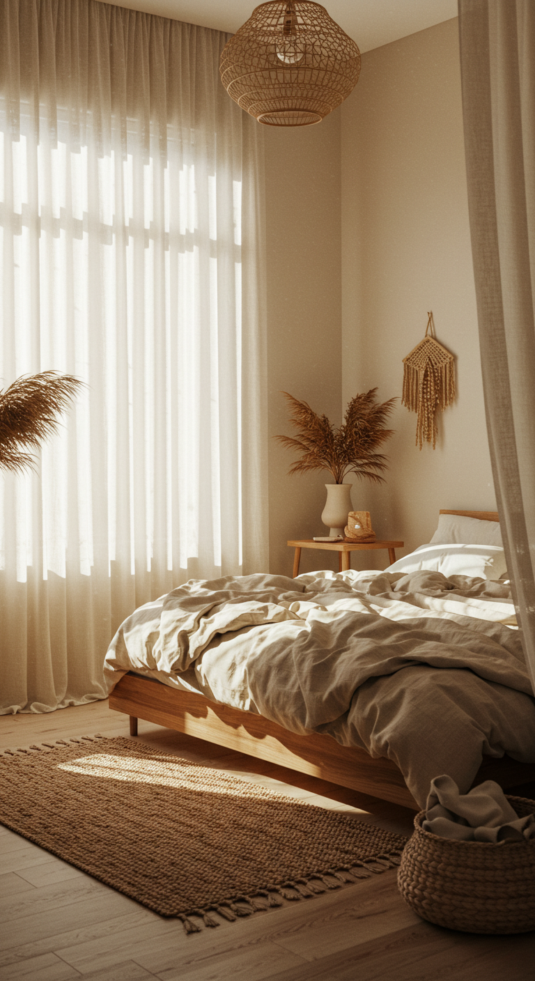 Les rideaux en lin naturel filtrent délicatement la lumière tout en préservant l’intimité. Leur texture organique et leurs plis naturels apportent une élégance décontractée à la chambre. Choisissez des tons naturels comme l’écru, le lin brut ou le blanc cassé. Installez-les généreusement pour créer un effet de drapé sophistiqué qui encadre joliment les fenêtres.
