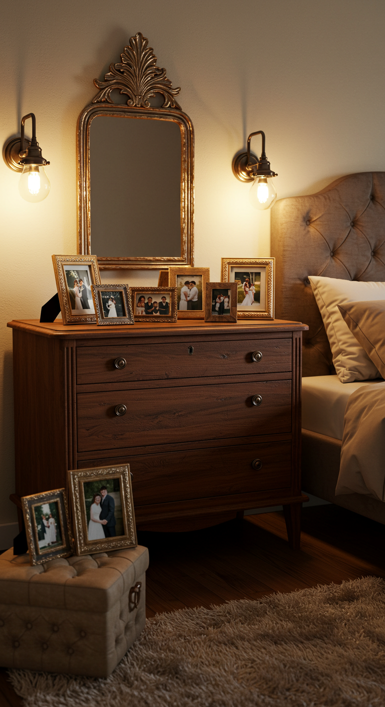 Personnalisez votre chambre avec des photos de vos plus beaux souvenirs dans des cadres élégants. Choisissez des cadres dorés, en bois naturel ou blancs pour s’harmoniser avec votre décoration. Disposez-les sur les tables de chevet, la coiffeuse ou créez une galerie murale. Ces touches personnelles renforcent l’intimité et racontent votre histoire d’amour.