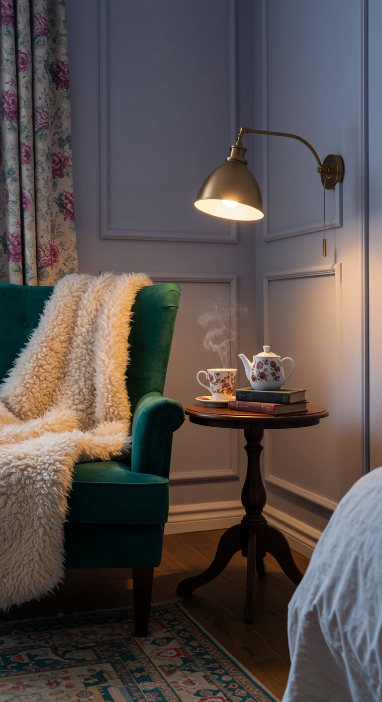 Aménagez un coin lecture avec un fauteuil confortable habillé d’un plaid doux. Ajoutez une petite table d’appoint pour poser une tasse de thé et vos livres favoris. Cet espace dédié à la détente permet de s’évader ensemble ou individuellement, ajoutant une dimension cosy à votre chambre romantique.