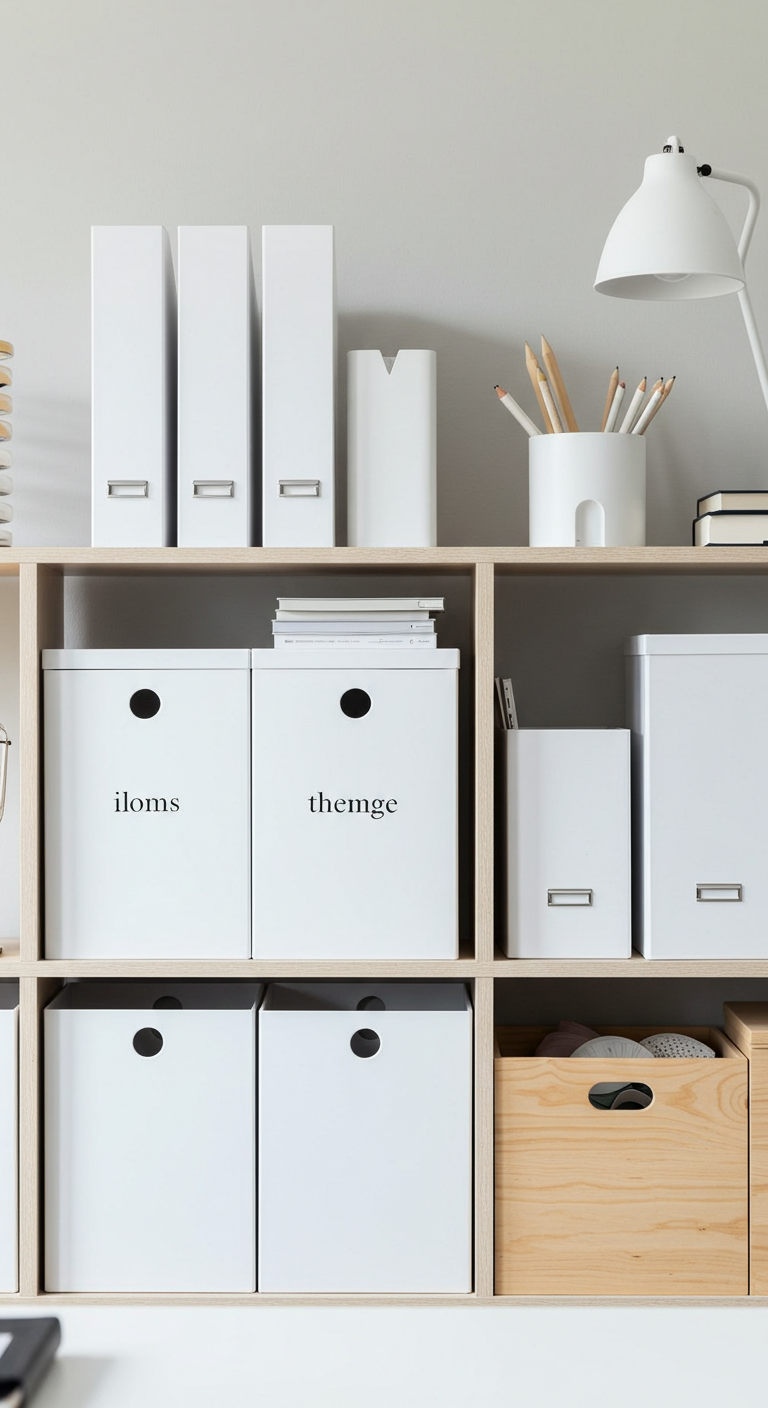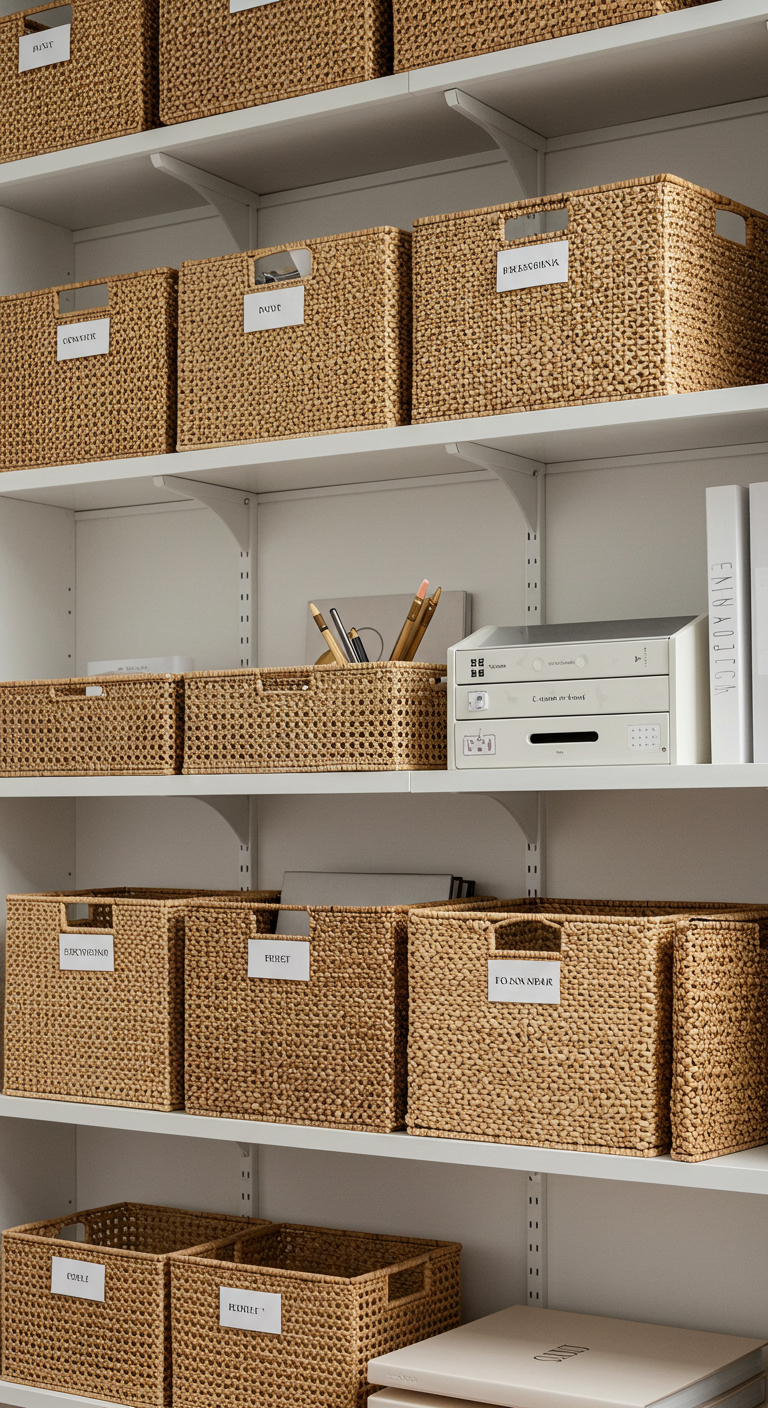 Conseils d’organisation : Étiquetez discrètement chaque panier avec des tags minimalistes. Utilisez différentes tailles pour différentes catégories : petits paniers pour les fournitures, moyens pour les documents, grands pour les équipements. Placez les articles les plus utilisés à hauteur de bras.