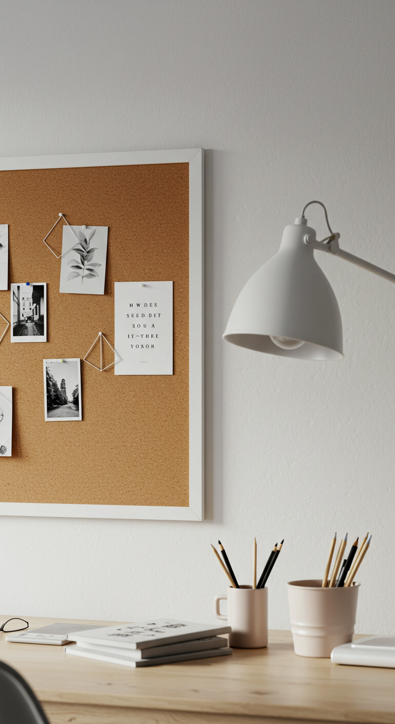 Un tableau en liège encadré de blanc ou de bois clair devient à la fois outil fonctionnel et élément décoratif. Ce tableau vous permet d’épingler calendriers, notes et inspirations tout en restant visuellement cohérent avec le style scandinave.