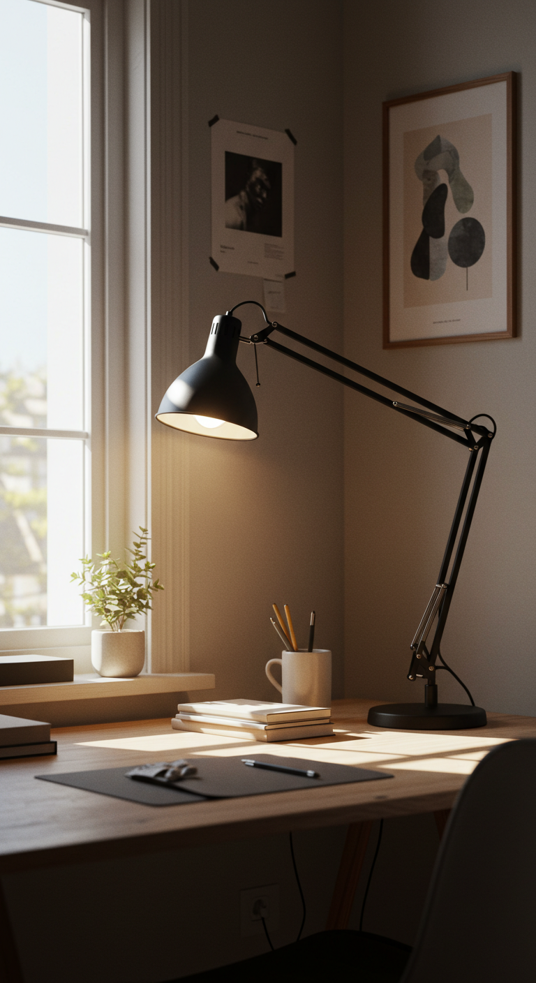 L’éclairage est crucial dans un bureau scandinave. Combinez la lumière naturelle avec une lampe de bureau articulée – de préférence en métal mat noir ou blanc – qui offre un éclairage directionnel précis pour vos tâches. Ajoutez une lumière d’ambiance douce pour les soirées.