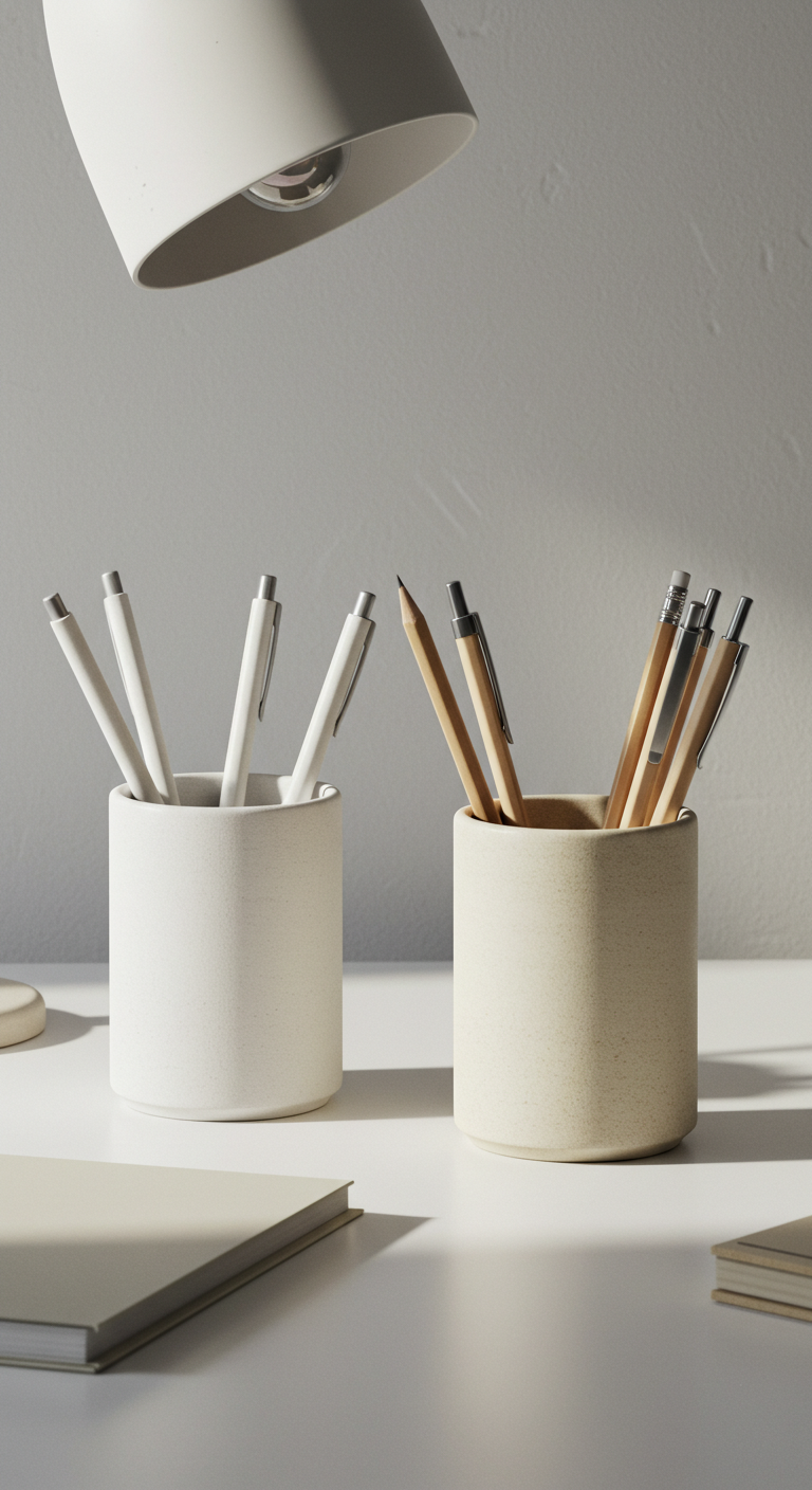 Remplacez les pots à crayons plastiques par des contenants en céramique artisanale aux tons neutres. Ces pièces uniques en blanc, beige ou gris ajoutent une touche d’authenticité tout en gardant vos outils d’écriture parfaitement organisés.