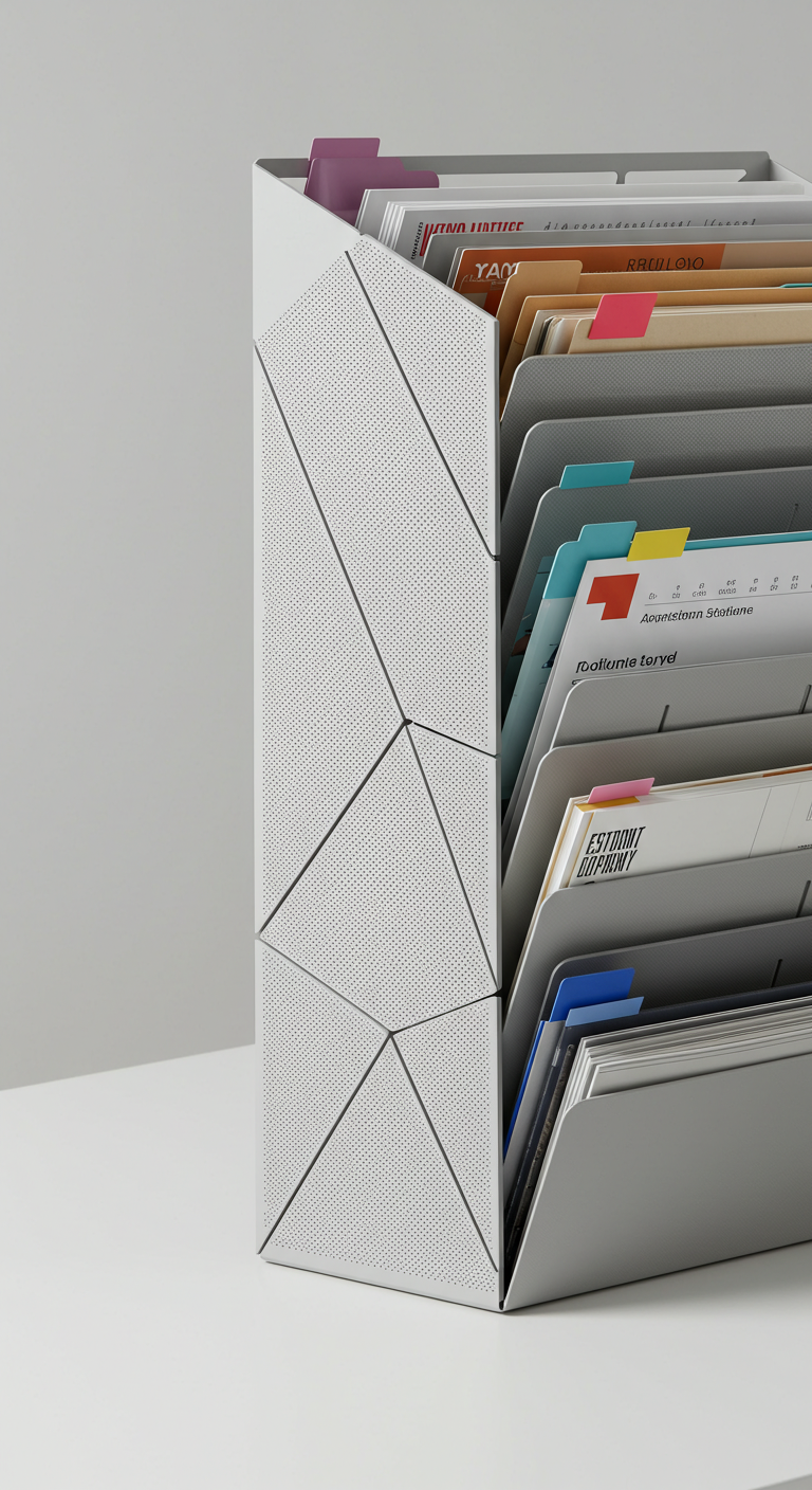 Conseils d’organisation : Utilisez un code couleur minimal – trois couleurs maximum. Étiquetez clairement chaque section. Adoptez la règle “FIFO” (First In, First Out) : archivez ou éliminez régulièrement les anciens documents. Gardez uniquement les documents actifs dans ce système de bureau.