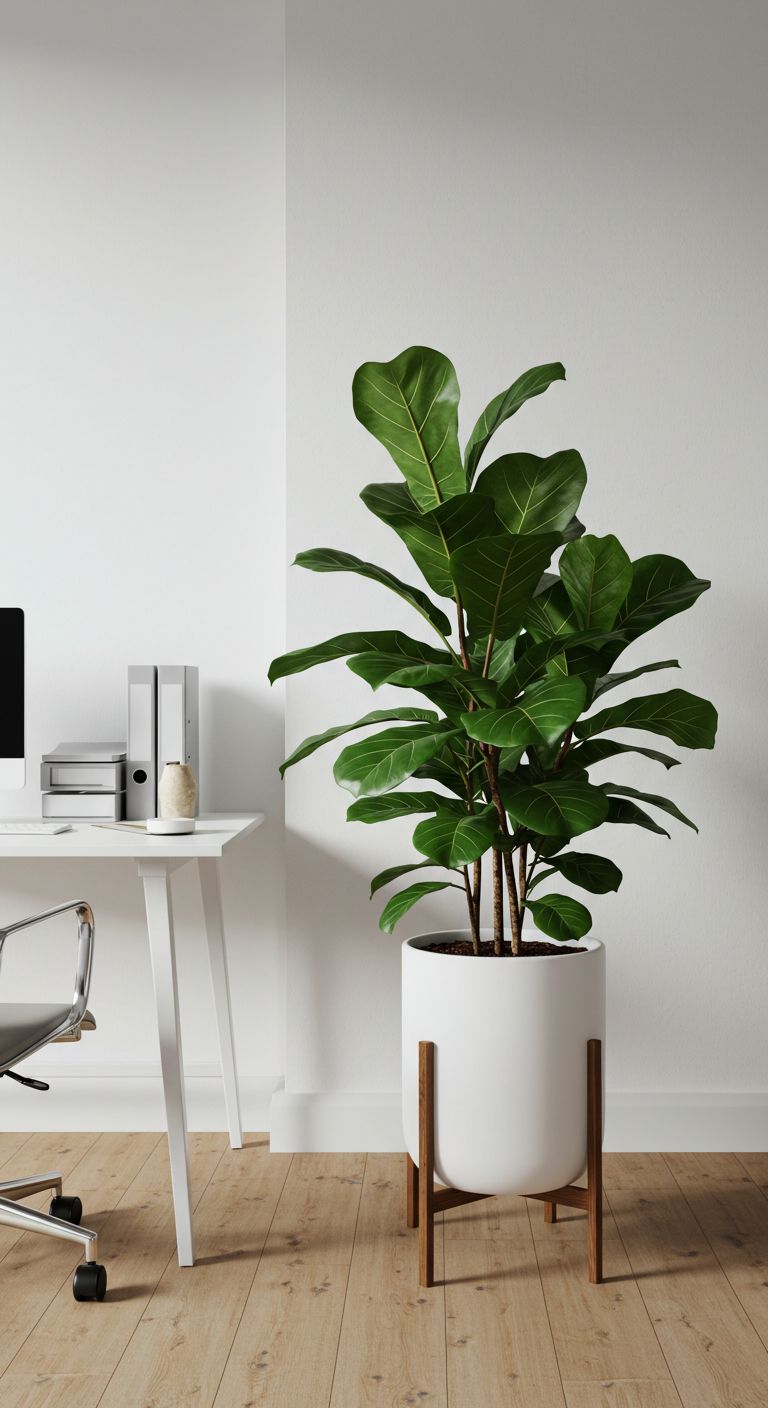 Intégrez au moins une plante verte substantielle – Monstera, Ficus lyrata ou Sansevieria – dans un pot en céramique blanche ou en cache-pot tressé naturel. Les plantes sont essentielles dans le design scandinave, apportant vie et fraîcheur à l’espace de travail.