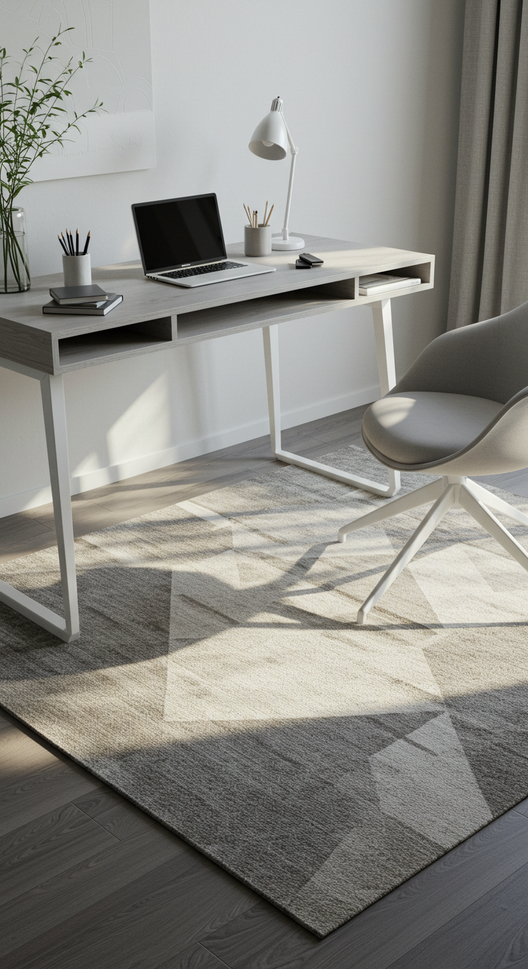 Un tapis aux motifs géométriques subtils en gris, blanc et beige délimite visuellement votre espace de travail tout en ajoutant confort et absorption acoustique. Privilégiez les motifs simples – triangles, lignes, cercles – caractéristiques du design nordique.