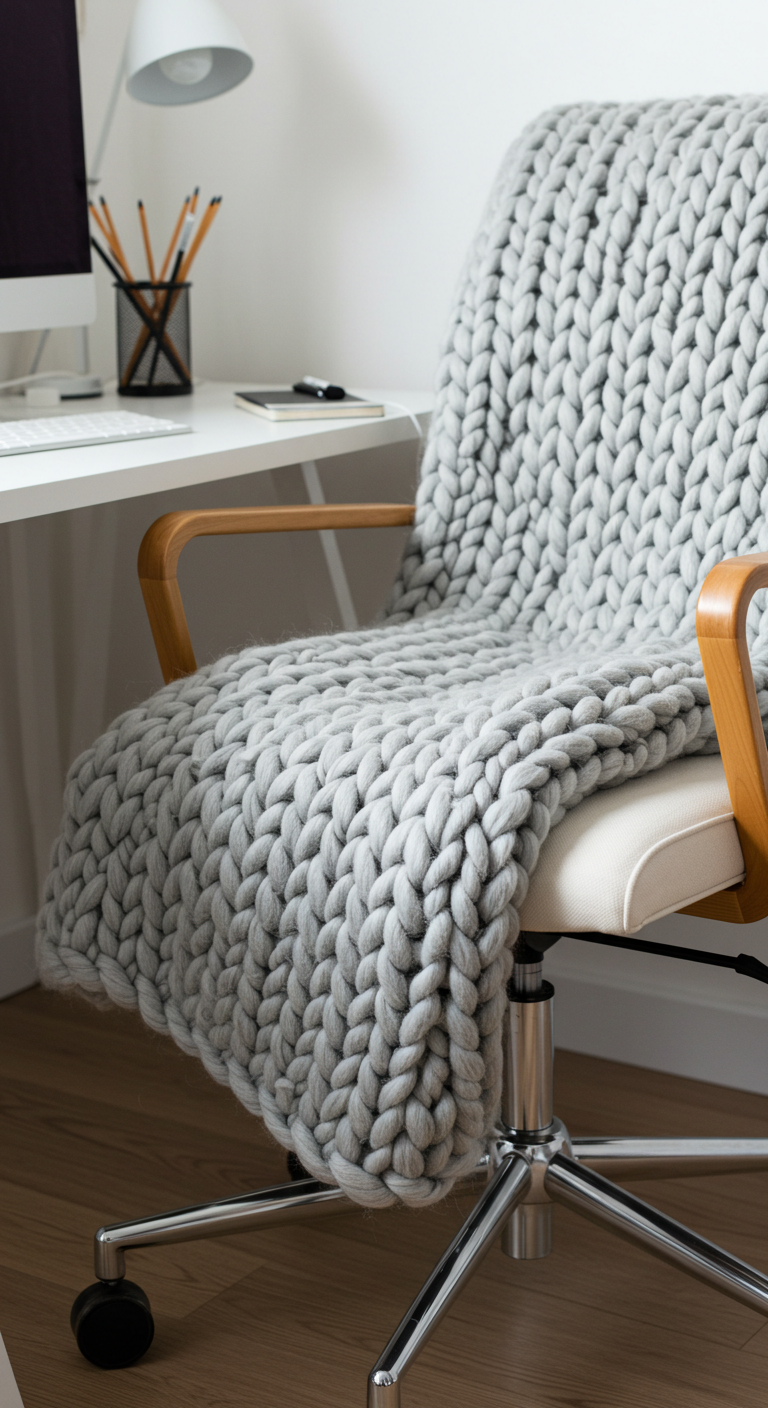 Un plaid en laine épaisse de couleur neutre – crème, gris clair ou beige – élégamment drapé sur le dossier de votre chaise ajoute confort, texture et une touche du fameux “hygge” scandinave à votre espace de travail.