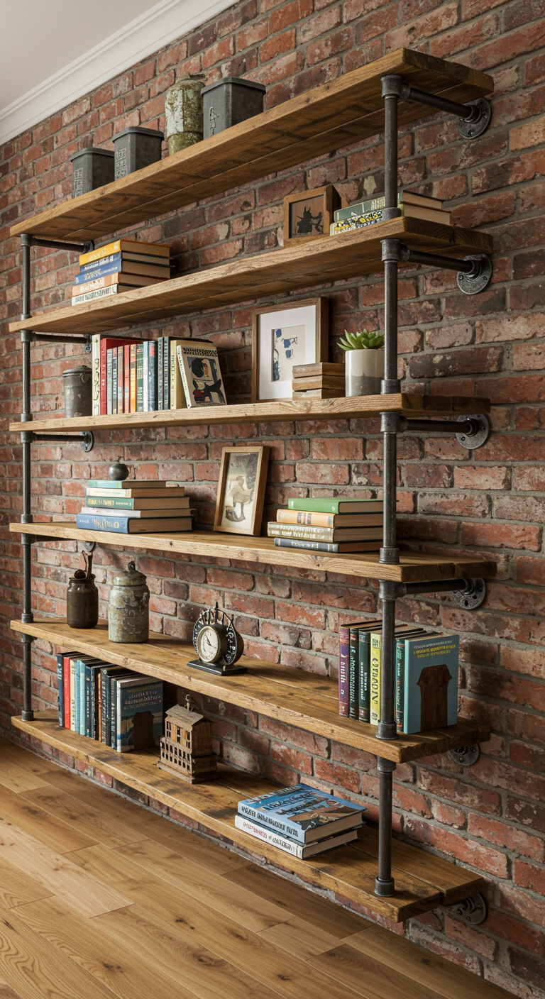 L’installation de ces étagères permet de créer des compositions murales dynamiques, en mélangeant livres, objets décoratifs, plantes vertes et éléments industriels vintage.