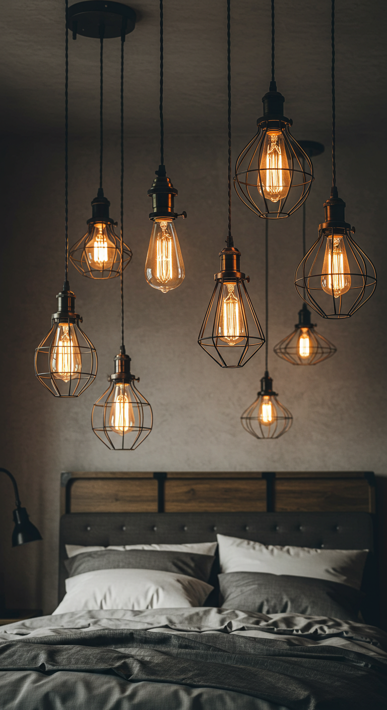Pour optimiser cet aménagement, privilégiez des suspensions en métal noir ou cuivré, et variez les formes (cylindrique, globe, cage) pour créer un ensemble harmonieux mais non uniforme, caractéristique du style industriel.