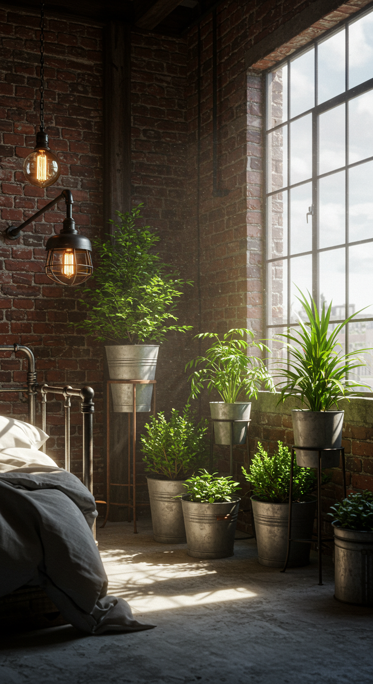 Les plantes vertes dans contenants métalliques apportent vie et fraîcheur à l’univers brut de la chambre industrielle loft. Cette alliance entre nature et industrie crée un contraste saisissant et apporte l’équilibre nécessaire à l’espace.