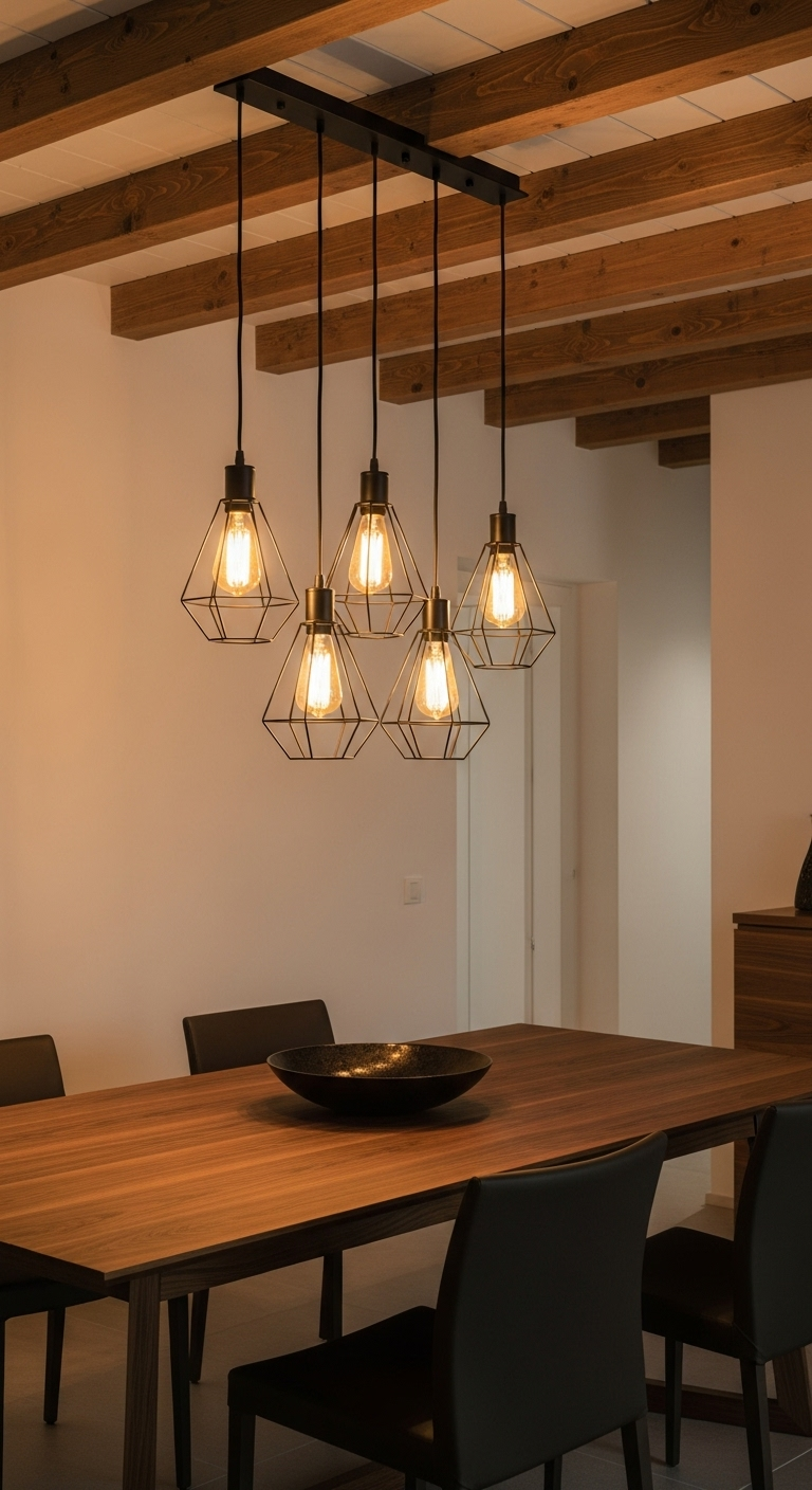 Optez pour des suspensions avec des abat-jours en métal noir mat, style entrepôt ou cage métallique. Les ampoules Edison apparentes ajoutent une touche vintage parfaite. Suspendez-les à différentes hauteurs au-dessus d’une table à manger ou d’un îlot de cuisine pour créer un effet dramatique. Ces luminaires fonctionnent particulièrement bien dans les espaces avec de hauts plafonds ou des poutres apparentes. Le contraste entre la lumière chaude des ampoules et le noir mat profond crée une atmosphère à la fois chaleureuse et sophistiquée, idéale pour les dîners intimes ou les réunions familiales.
