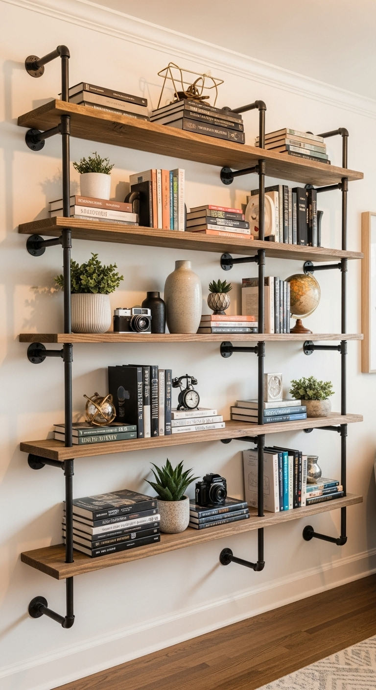Ces étagères apportent une dimension architecturale à vos murs tout en créant des espaces de rangement et d’exposition personnalisables. Utilisez du bois récupéré ou vieilli pour les tablettes afin d’accentuer le contraste avec le métal noir. Disposez vos livres préférés, des plantes en pots, des objets décoratifs ou des souvenirs de voyage. La structure ouverte maintient une sensation d’espace aérée malgré le stockage. Ces étagères fonctionnent admirablement dans les salons, bureaux, cuisines ou même les salles de bain, s’adaptant à tous vos besoins de rangement avec style.