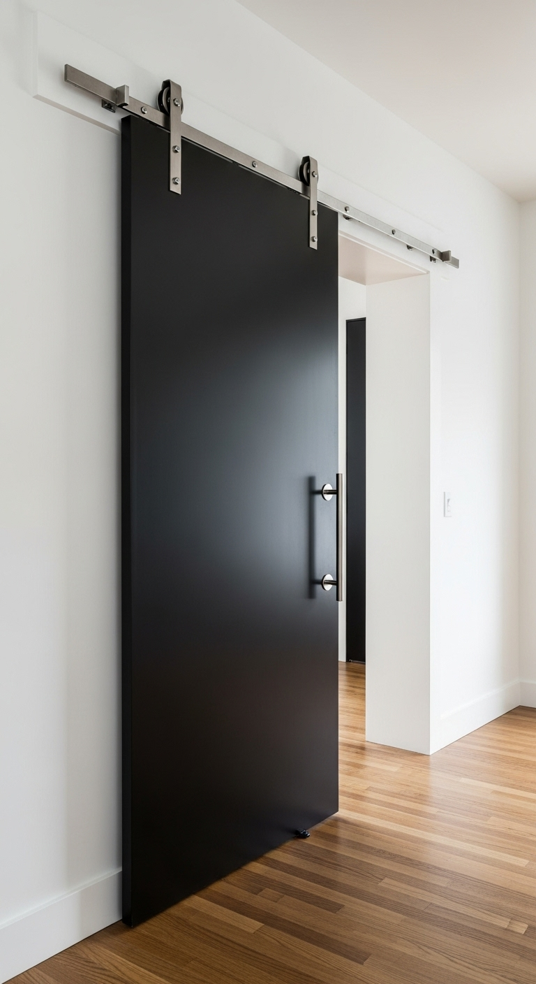 Le noir mat sur une porte coulissante crée un point focal dramatique qui attire immédiatement le regard. Le quincaillerie apparente en métal noir, avec son rail et ses roulettes, ajoute un intérêt visuel supplémentaire. Cette option est idéale pour séparer des espaces comme la chambre et la salle de bain, ou pour fermer un dressing. La finition mate absorbe la lumière de manière élégante, évitant les reflets disgracieux. Associez cette porte à des murs blancs ou gris clair pour un contraste maximal. Le système coulissant est particulièrement adapté aux petits espaces où une porte battante traditionnelle serait encombrante.