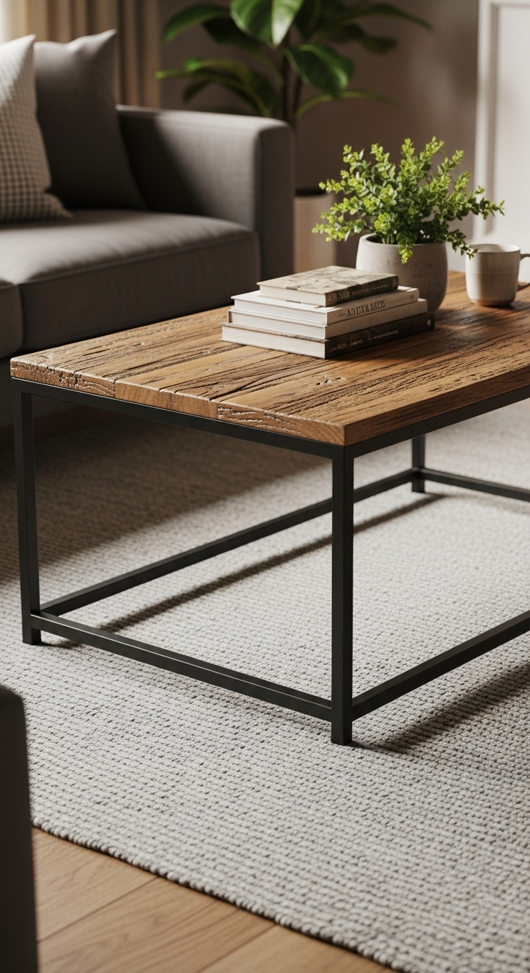 La table basse industrielle combinant métal noir mat et bois massif représente le cœur fonctionnel et esthétique de votre salon. Cette pièce maîtresse marie la robustesse du métal à la chaleur naturelle du bois.