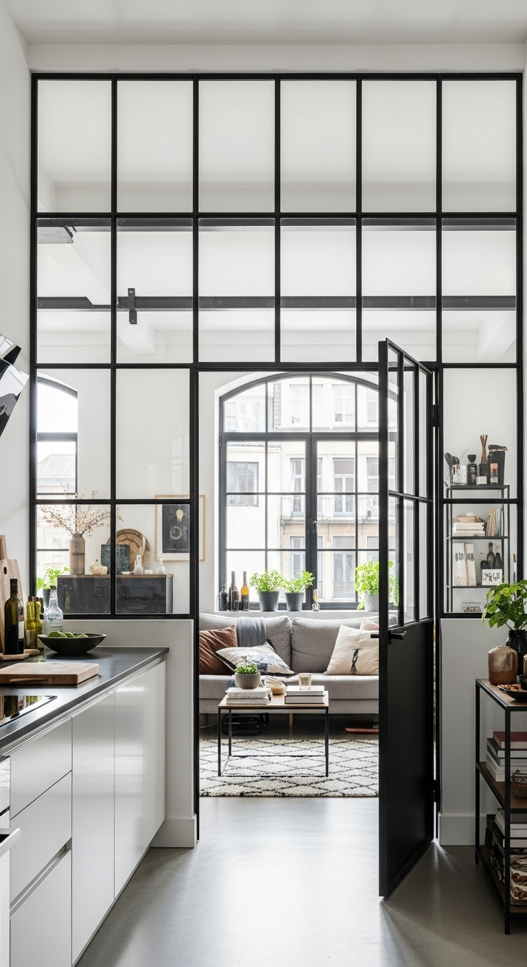 Les fenêtres et séparations style verrière avec cadres noir mat apportent une touche d’élégance industrielle tout en préservant la luminosité et l’ouverture des espaces. Ces structures légères créent des divisions visuelles sans cloisonner.