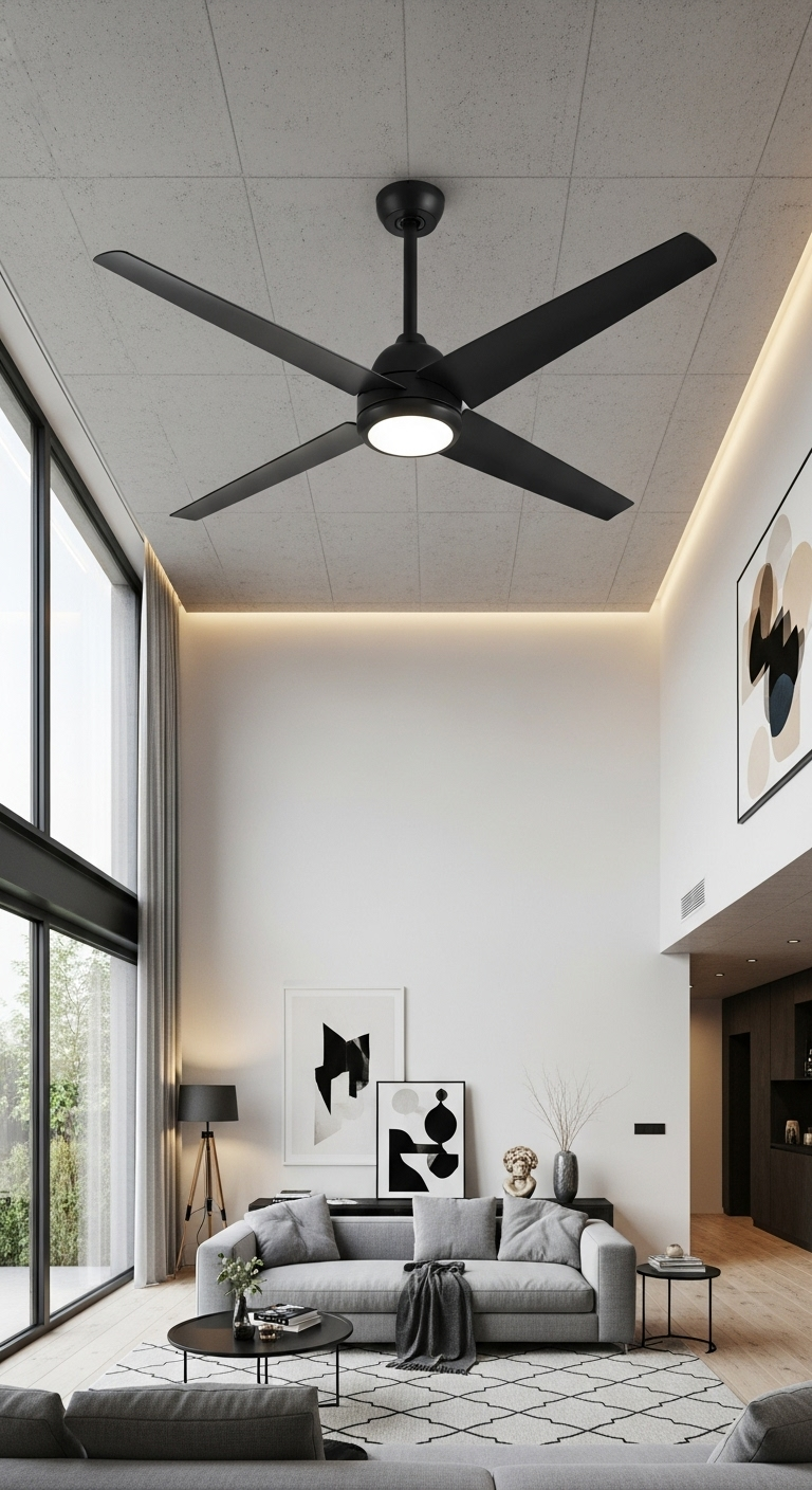 Le ventilateur de plafond en noir mat combine praticité et esthétique industrielle tout en ajoutant une dimension fonctionnelle souvent négligée dans la décoration. Cet appareil utilitaire devient un élément de design à part entière.
