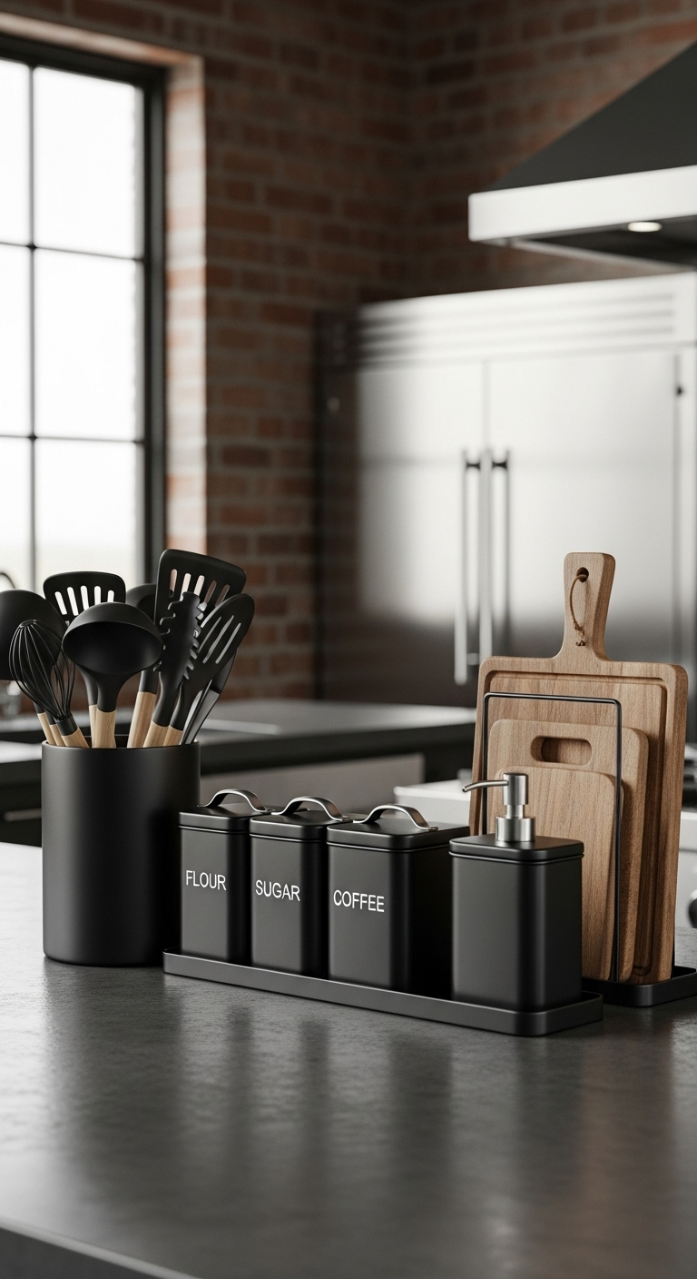 Les accessoires de cuisine en noir mat constituent la touche finale qui unifie votre espace culinaire industriel. Ces petits objets quotidiens transforment votre comptoir en une composition esthétique cohérente.