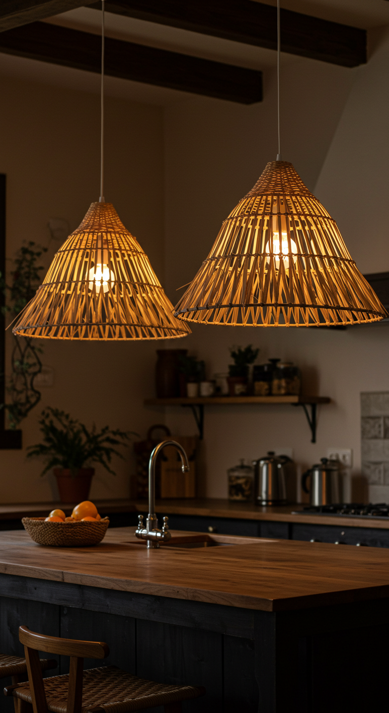 L’éclairage en fibres naturelles apporte une chaleur incomparable ! Suspendez des luminaires en rotin tressé ou en raphia au-dessus de votre îlot central. Ces pièces artisanales diffusent une lumière douce et tamisée, créant une ambiance cocooning parfaite pour vos soirées.