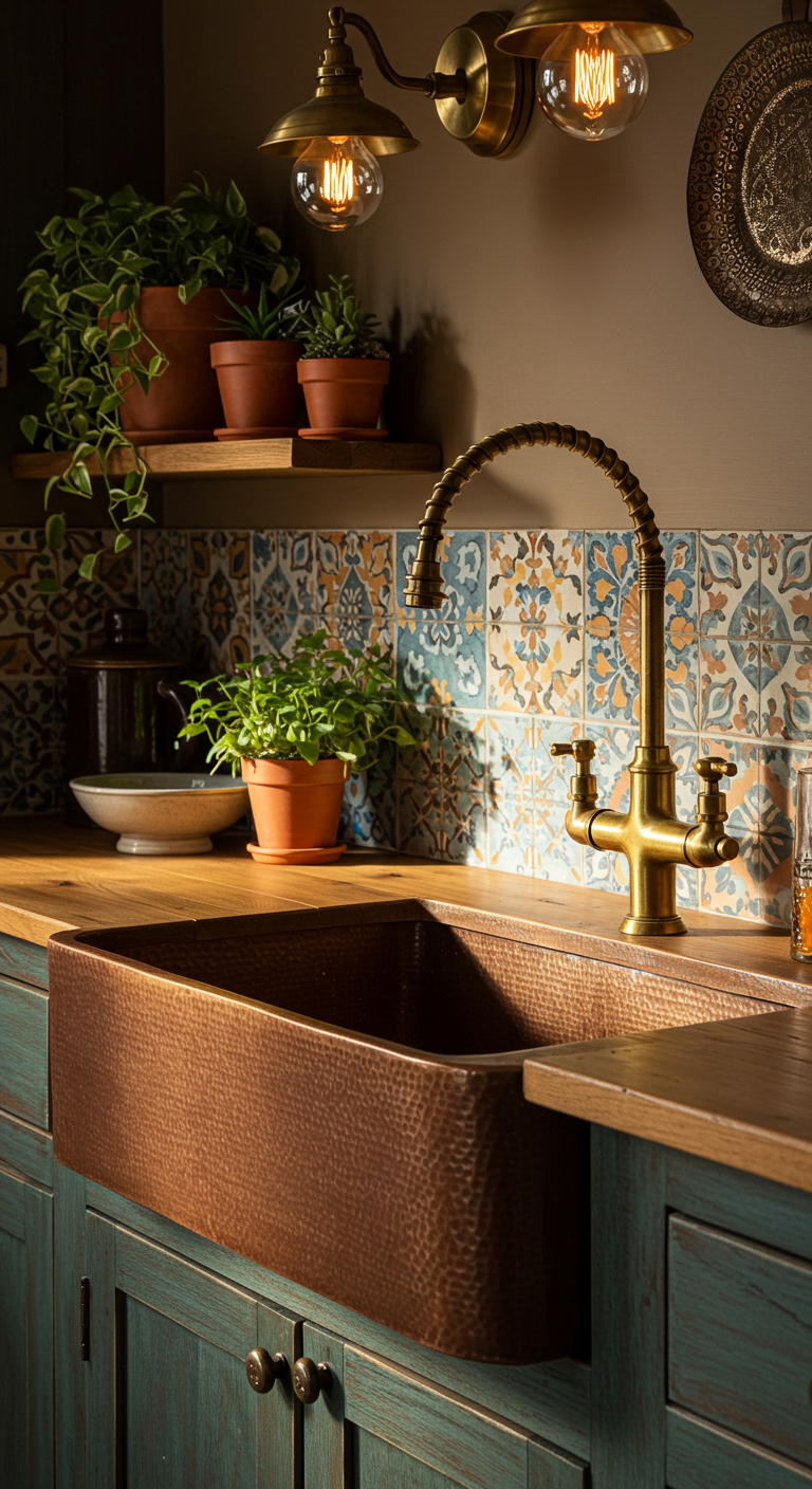 Un évier en cuivre patiné est la pièce maîtresse d’une cuisine bohème authentique ! Sa surface vieillie naturellement et ses reflets dorés apportent une noblesse incomparable. Le cuivre développe une patine unique qui s’embellit avec le temps.