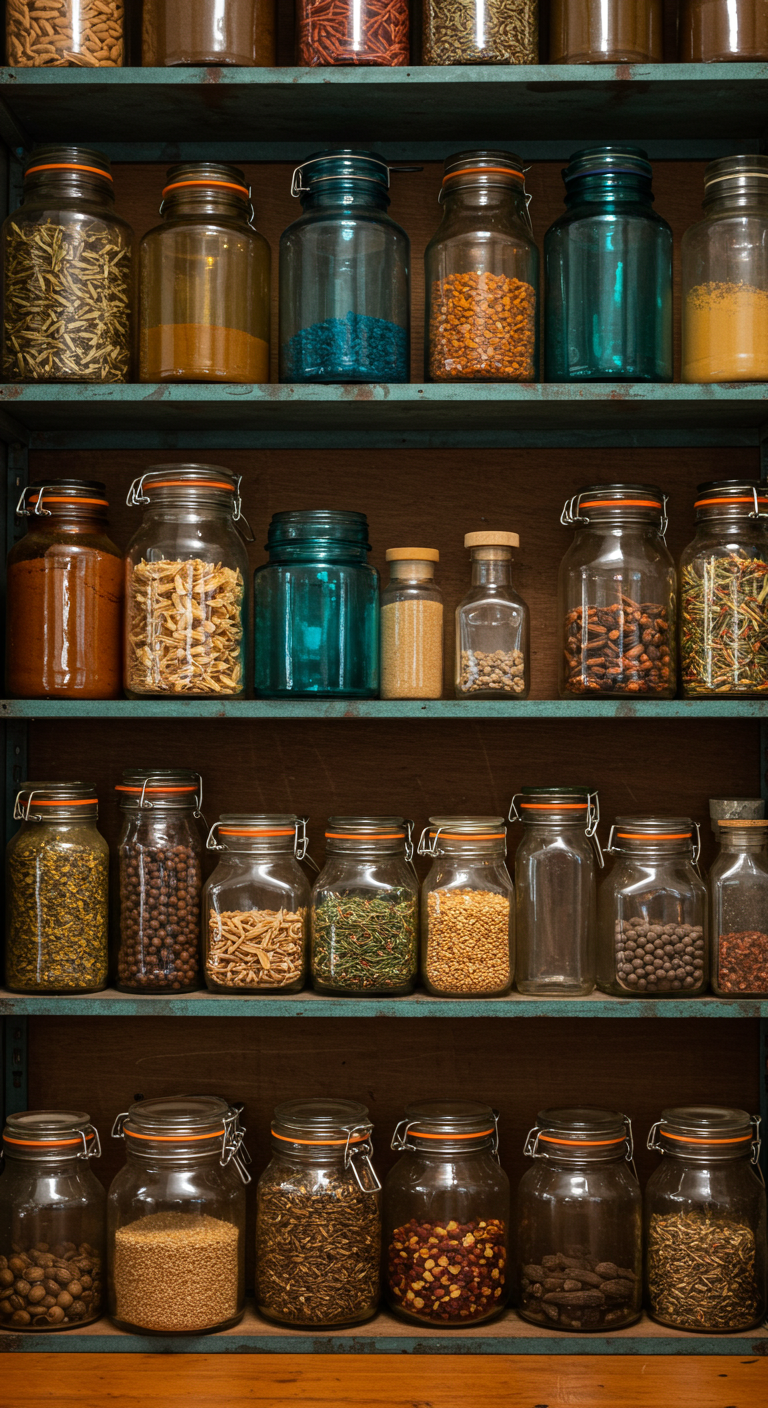 Organisation esthétique : Groupez les bocaux par familles de couleurs et variez les hauteurs pour créer un rythme visuel captivant.