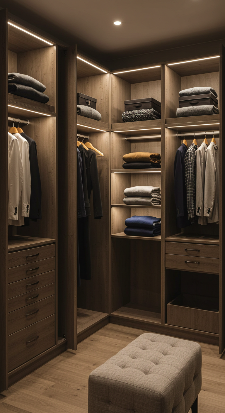 Créez une ambiance de boutique de luxe dans votre dressing avec un système d’éclairage LED sophistiqué qui sublime vos vêtements et facilite vos choix.