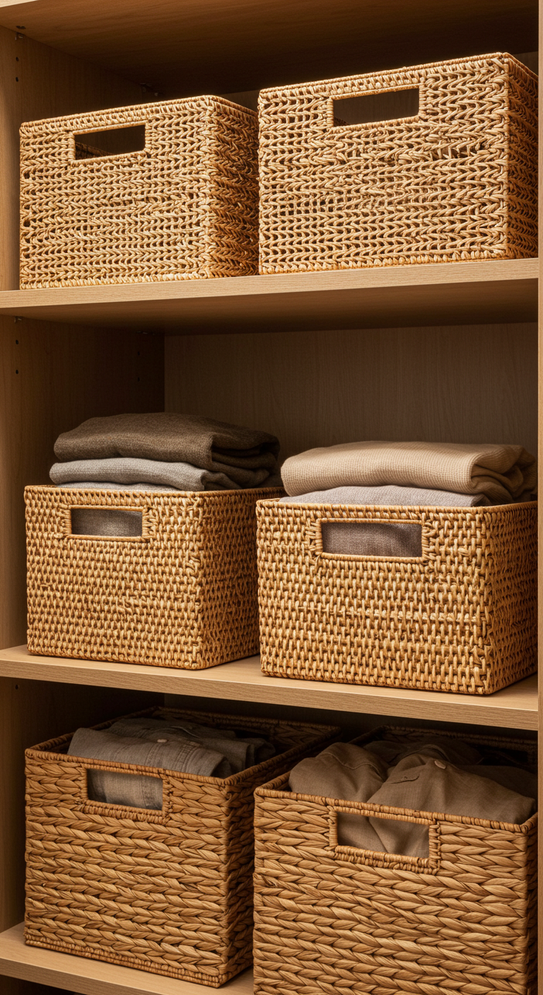 Apportez une touche de chaleur naturelle à votre dressing avec des paniers en matières organiques qui allient praticité et esthétique cocooning.