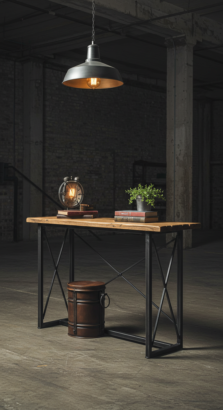 Une console alliant métal brut et bois recyclé incarne parfaitement l’esthétique industrielle urbaine. Cette pièce maîtresse offre un espace de rangement pratique tout en servant de présentoir pour vos objets décoratifs.