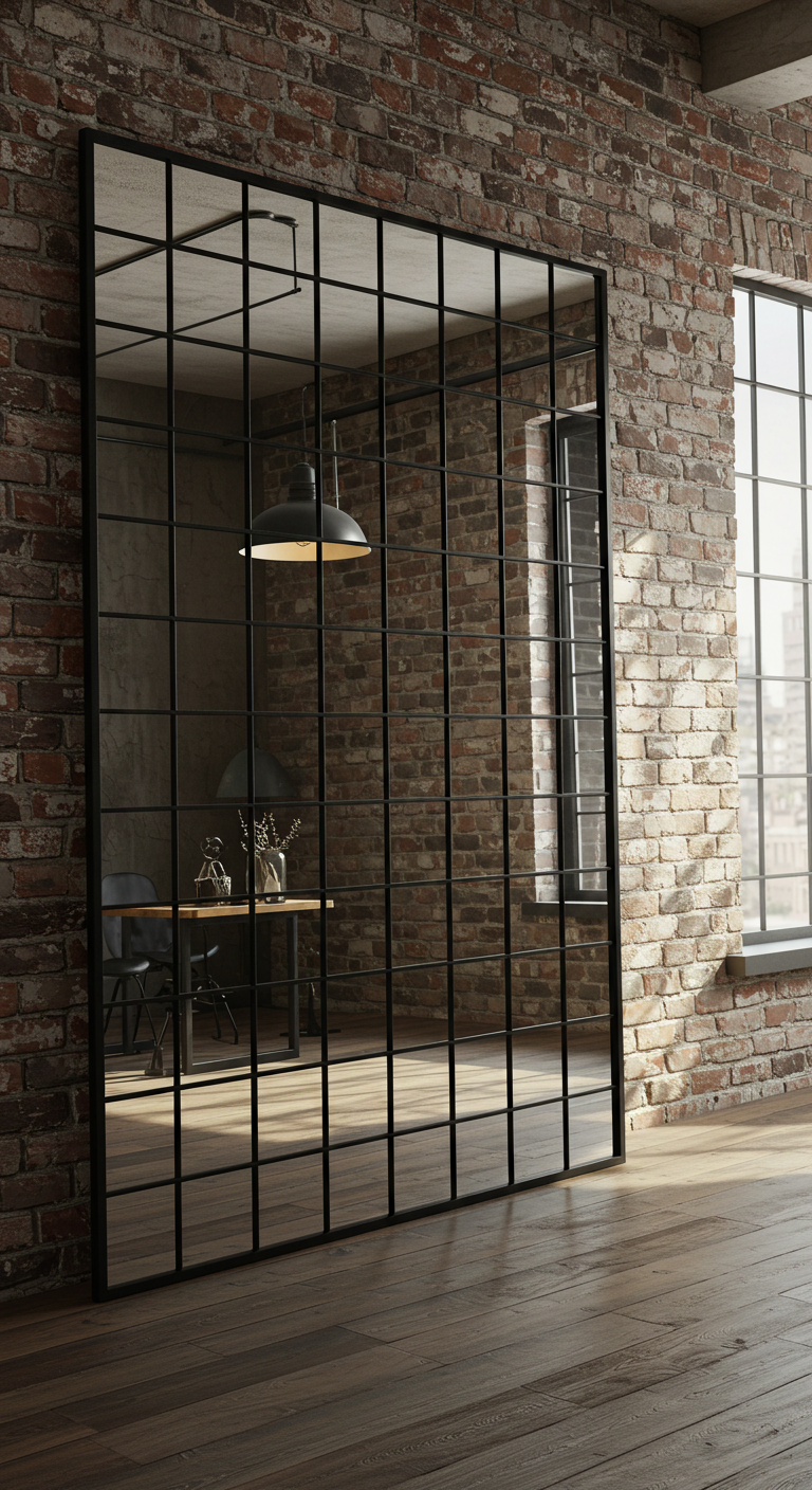 Un miroir au cadre métallique industriel agrandit visuellement l’espace tout en ajoutant une touche décorative sophistiquée. Le design géométrique du cadre renforce l’esthétique urbaine moderne.