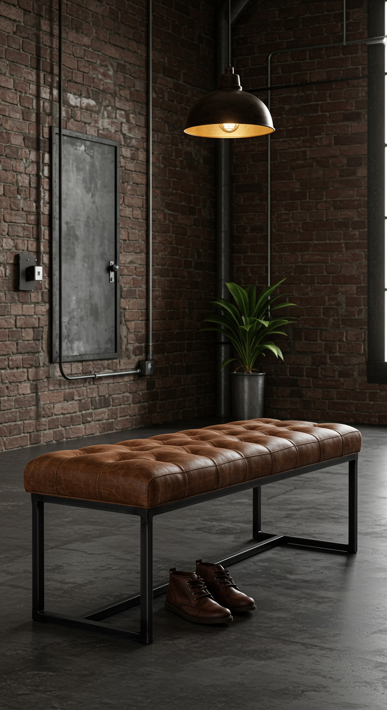 Une banquette combinant cuir vieilli et structure métallique offre un siège pratique tout en renforçant l’esthétique industrielle. Cette pièce fonctionnelle facilite l’enfilage des chaussures tout en servant d’élément décoratif.