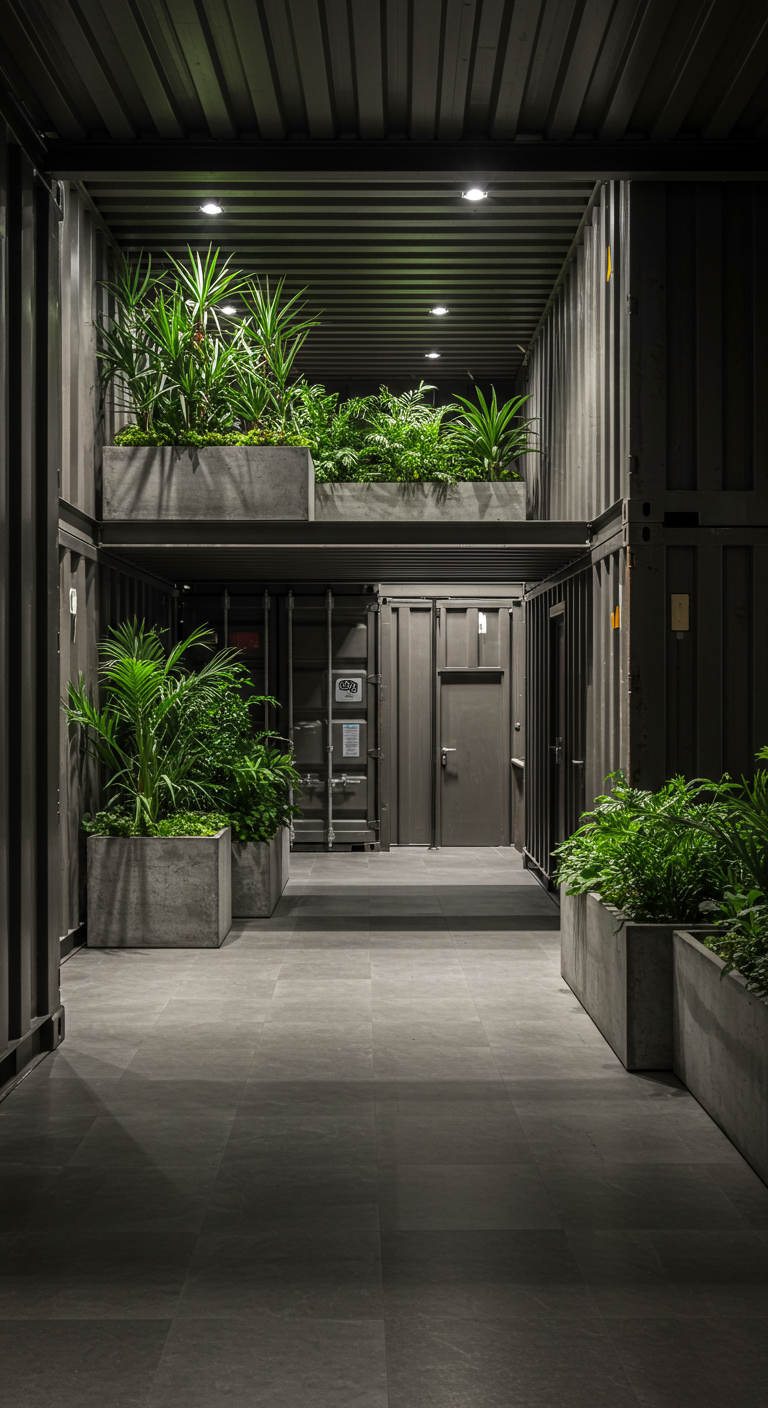 L’intégration de végétation dans des contenants industriels apporte vie et fraîcheur à l’entrée tout en respectant l’esthétique urbaine. Cette approche biophilique adoucit la rudesse des matériaux bruts.