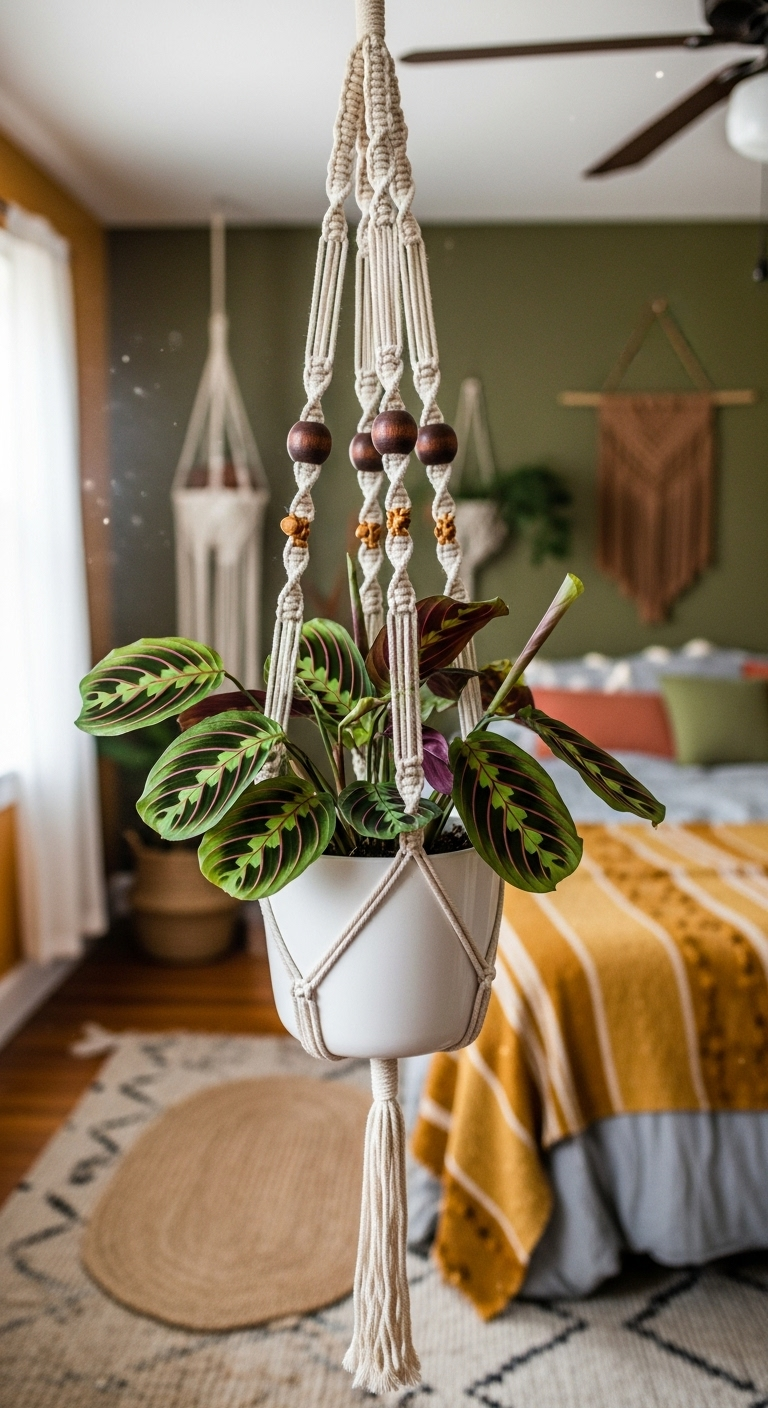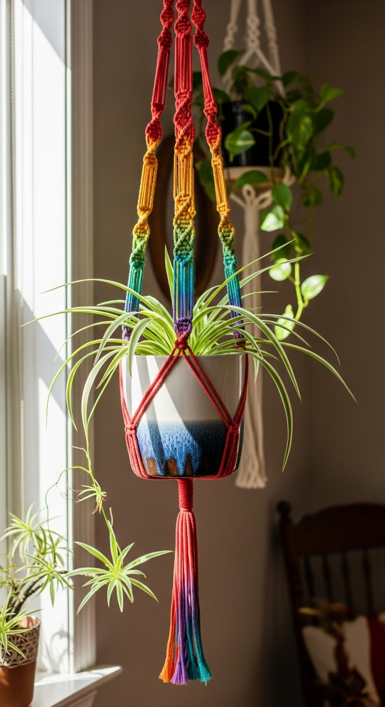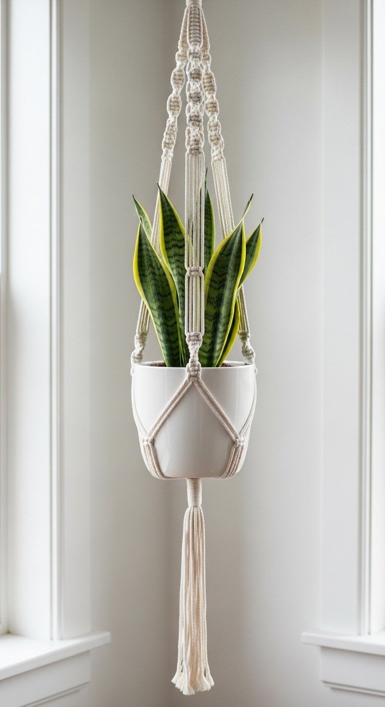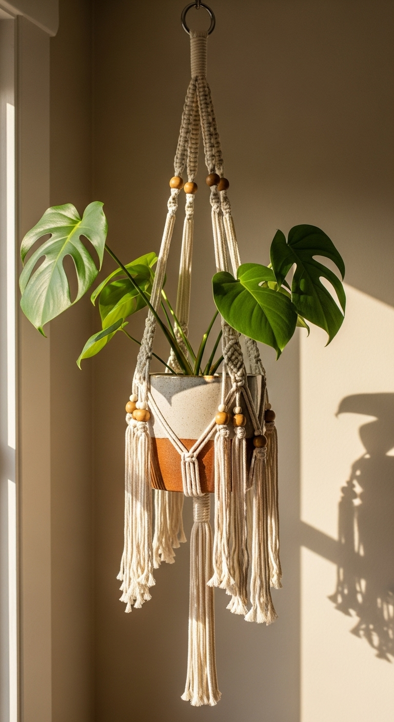 La suspension en cascade représente l’apogée de l’art du macramé vintage. Cette création élaborée permet de suspendre trois plantes à différentes hauteurs, créant un jardin vertical spectaculaire qui optimise l’espace tout en offrant un impact visuel saisissant. Chaque niveau est soigneusement espacé pour permettre aux plantes de recevoir suffisamment de lumière et de s’épanouir sans se gêner mutuellement.