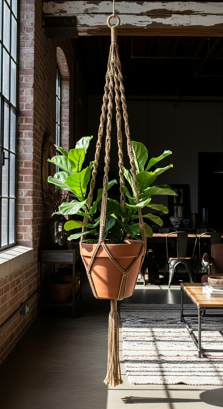 Ce type de cache-pot vintage convient parfaitement aux ficus lyrata, aux grandes fougères de Boston, aux alocasias majestueux ou aux monsteras bien développés. L’épaisseur des cordes, souvent de 8 à 10 millimètres, crée une présence visuelle forte qui équilibre le volume de la plante. La patine naturelle du jute vieilli ajoute des nuances de beige, de doré et de terre qui s’harmonisent magnifiquement avec les tons organiques des plantes. Dans un salon avec de hauts plafonds ou un atrium, cette suspension devient une pièce maîtresse spectaculaire qui définit l’atmosphère de toute la pièce. Le système de suspension nécessite un crochet de plafond solide et bien ancré pour supporter le poids conséquent de l’ensemble.