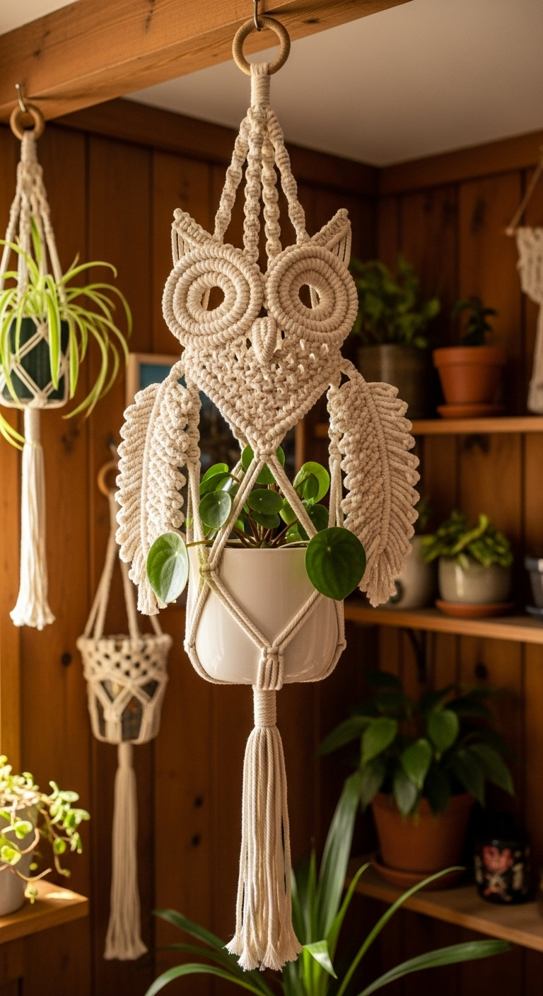 10. Le Cache-pot Macramé Vintage à Motifs de Hibou