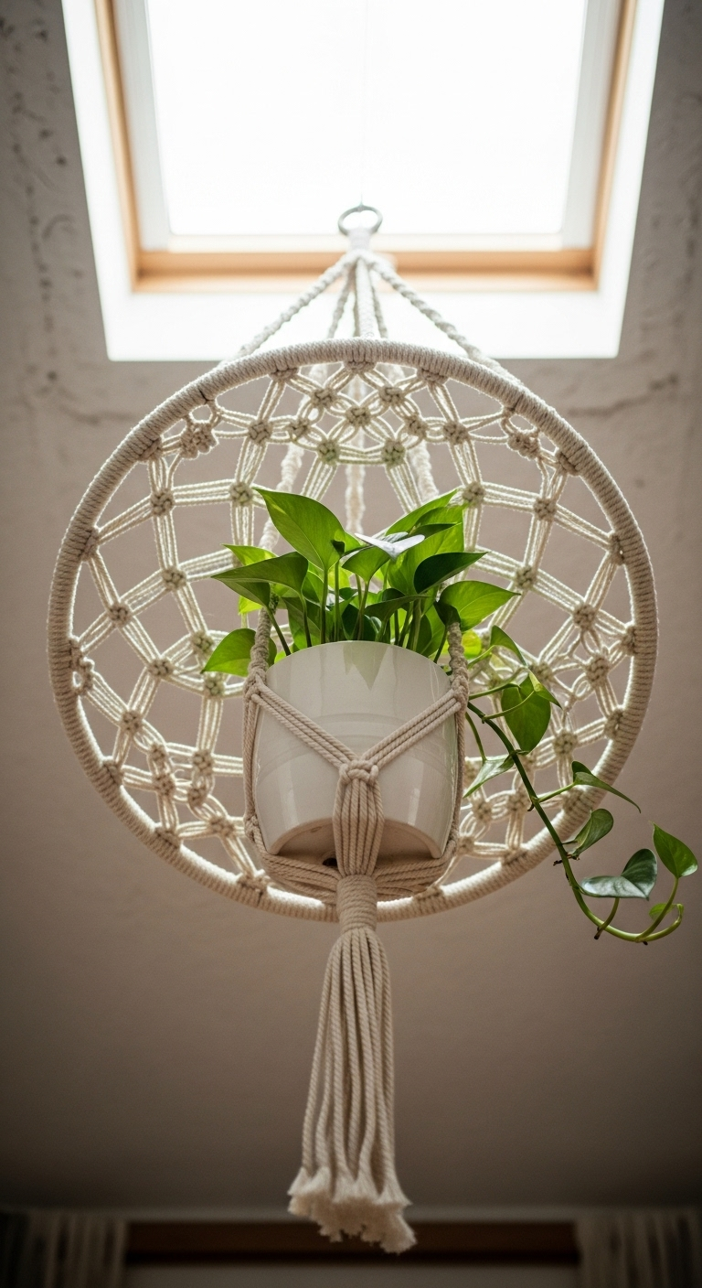 Ce modèle vintage en jute naturel présente souvent des motifs complexes alternant nœuds carrés, torsades en spirale et diamants décoratifs. La patine du temps donne au jute une couleur miel profond particulièrement chaleureuse. Cette suspension convient parfaitement aux succulentes, aux petites fougères ou aux plantes aromatiques comme le basilic et la menthe. Installez-la près d’une fenêtre de cuisine ou dans un coin lecture pour créer une ambiance cosy et verdoyante. Le jeu des hauteurs différentes ajoute de la profondeur à votre décoration et transforme un simple coin en un véritable jardin suspendu vintage.