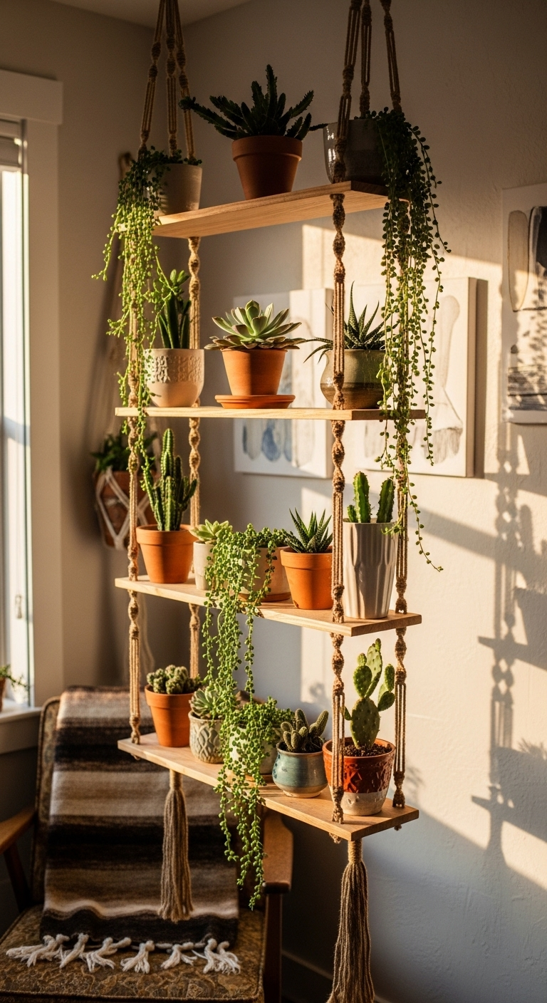16. Le Cache-pot Macramé Vintage à Étages Style Bibliothèque Suspendue