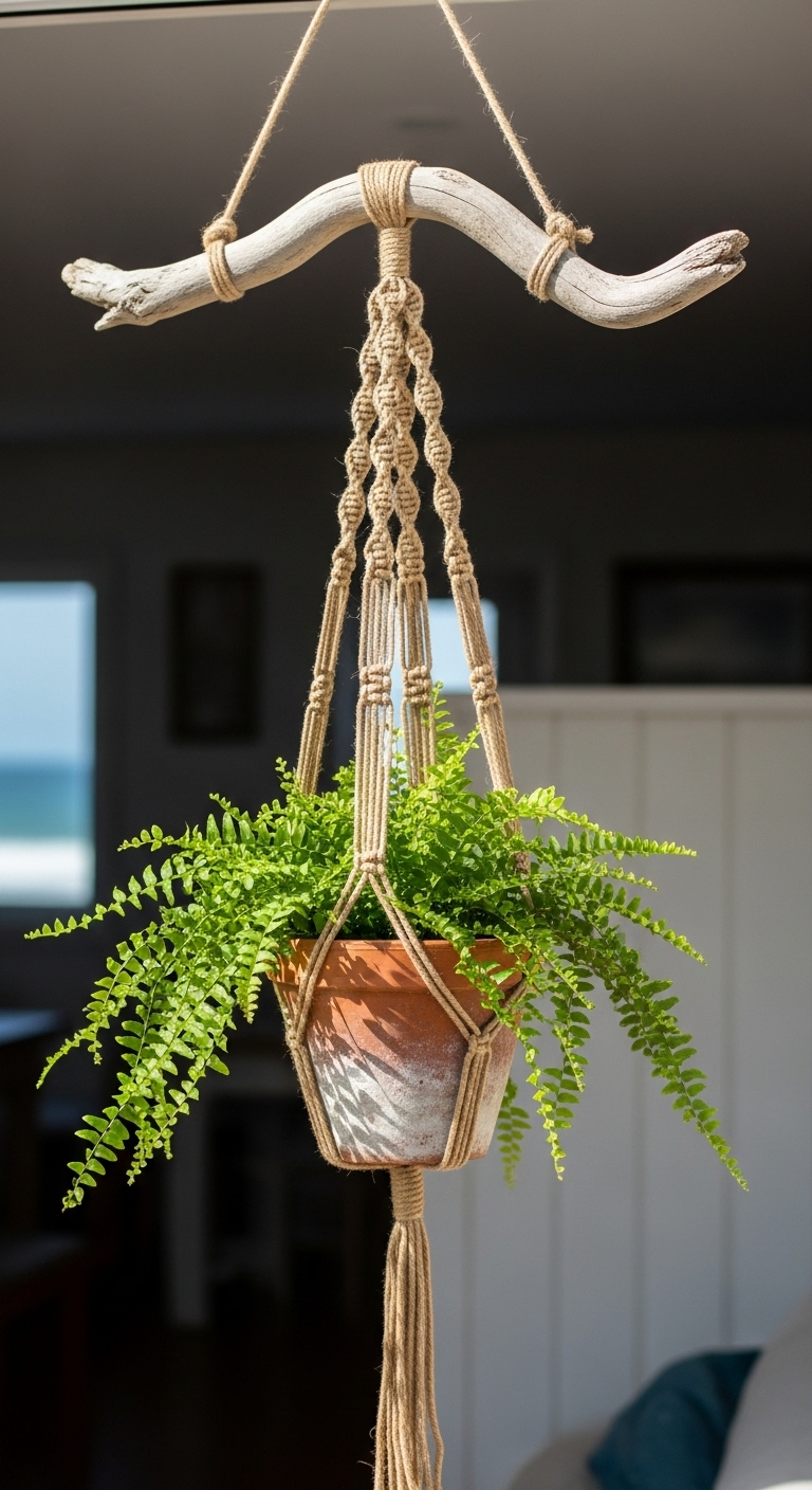 13. Le Cache-pot Macramé Vintage avec Support en Bois Flotté