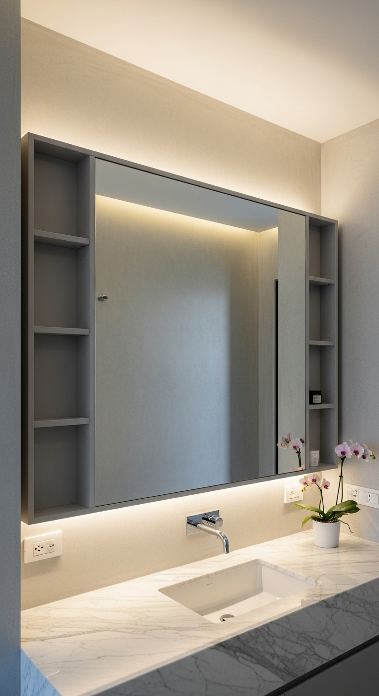 Le miroir armoire encastré transforme la salle de bain en un espace de rangement optimisé tout en préservant une esthétique minimaliste irréprochable. Cette solution consiste à intégrer directement dans l’épaisseur du mur une armoire dont la porte est un miroir sans cadre apparent. Le résultat visuel est celui d’un simple miroir élégant, alors que derrière se cache un système de rangement complet pour tous vos produits de beauté et d’hygiène.