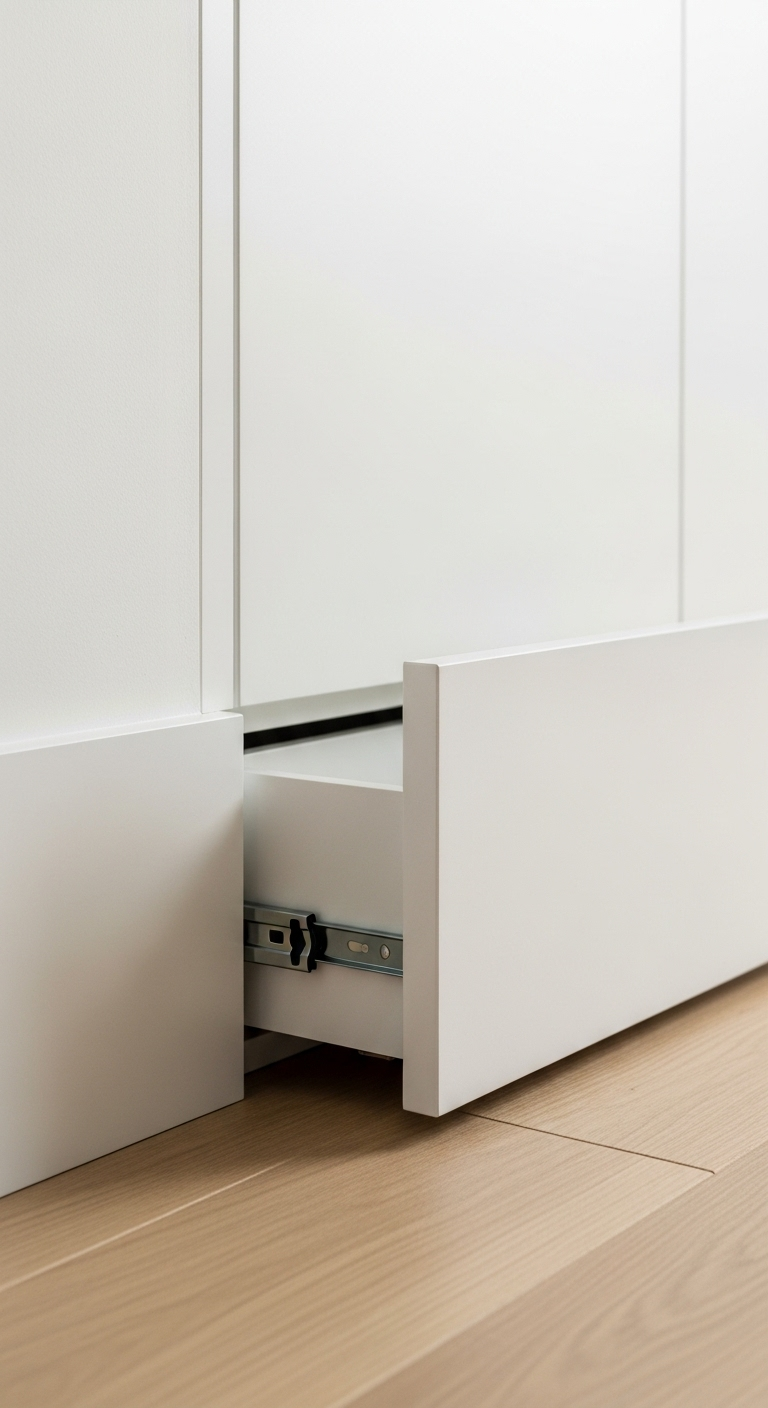 Pour une intégration parfaite, la plinthe-tiroir doit être peinte dans la même couleur que les plinthes standard et les murs adjacents. Le mécanisme de glissement doit être de haute qualité pour garantir une ouverture fluide malgré la longueur du tiroir. Cette solution est particulièrement appréciée dans les espaces restreints où chaque centimètre compte, transformant un élément purement décoratif en espace fonctionnel sans aucun impact visuel.