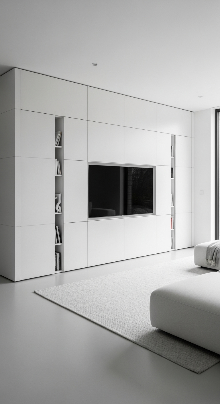 Le génie de cette conception réside dans sa polyvalence : les panneaux peuvent être ouverts partiellement pour accéder aux objets rangés ou complètement fermés pour créer un mur uniforme et épuré. Les compartiments cachés peuvent accueillir livres, objets décoratifs, équipements électroniques, jeux, et même une petite collection de vinyles ou DVDs. Le système de gestion des câbles intégré garantit qu’aucun fil ne vient gâcher l’esthétique minimaliste.