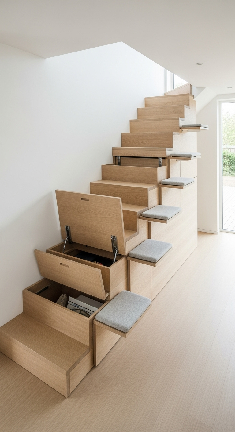 15. Marches d’Escalier Transformables en Sièges-Rangements
