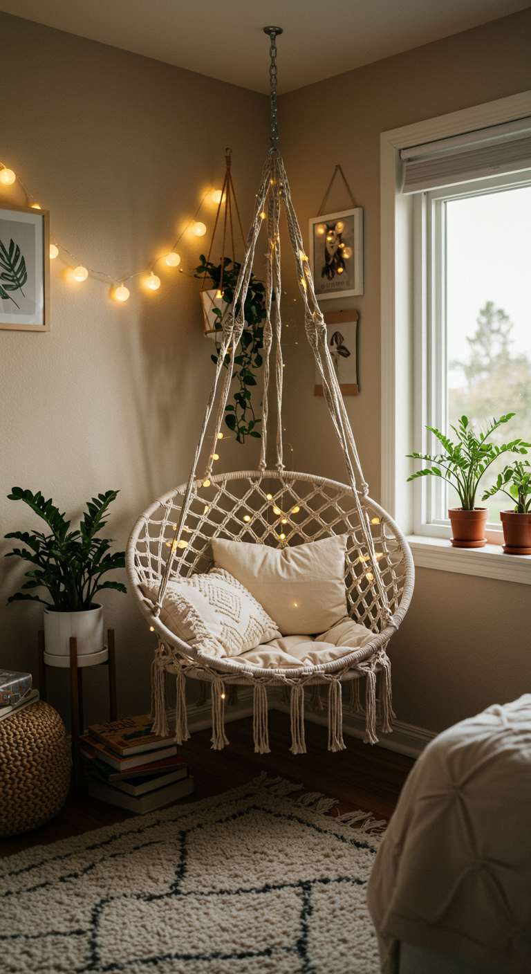 Créez un véritable cocon de détente avec une chaise suspendue ou un fauteuil œuf. Ajoutez des coussins moelleux aux textures variées, des plaids en matières naturelles et quelques plantes vertes pour une ambiance bohème ultra-cosy. Les guirlandes lumineuses ajoutent une touche magique parfaite pour les soirées lecture. Cette zone devient rapidement le spot favori de votre ado pour se relaxer, lire ou simplement rêvasser.