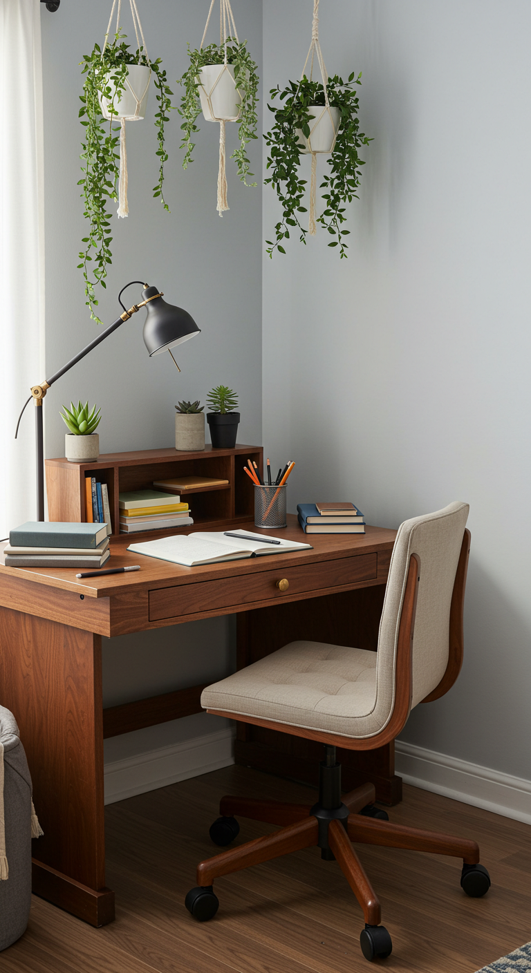 Aménagez un espace de travail inspirant avec un bureau en bois naturel, des étagères murales et une collection de plantes suspendues. L’éclairage est crucial : combinez une lampe de bureau design avec des sources lumineuses douces. Ajoutez des organisateurs esthétiques et des fournitures dans des tons coordonnés pour stimuler la créativité et la productivité.
