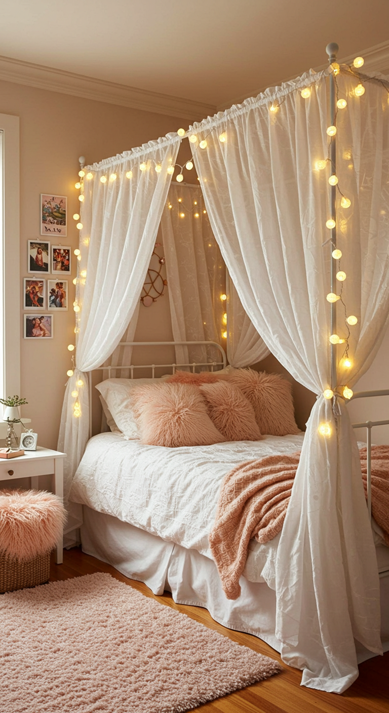 Créez une atmosphère romantique et cosy avec un ciel de lit en tissus légers. Les rideaux en voilage blanc ou crème ajoutent une dimension poétique à l’espace. Intégrez discrètement des guirlandes lumineuses dans les plis du tissu pour un effet féérique. Cette décoration transforme le lit en véritable cocon privé, parfait pour une ado rêveuse.
