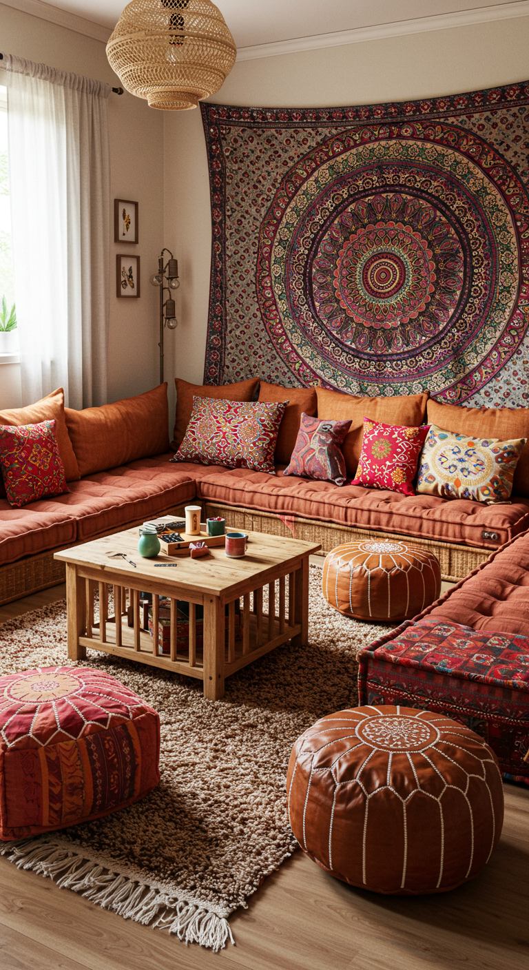 Créez un salon au sol avec de gros coussins, des poufs en matières naturelles et une table basse. Cette zone conviviale est parfaite pour recevoir des amis ou se détendre. Ajoutez une tapisserie murale comme toile de fond et des lanternes pour l’éclairage d’ambiance. Cette déco nomade s’adapte facilement aux envies et aux activités.